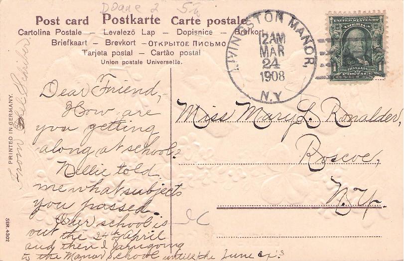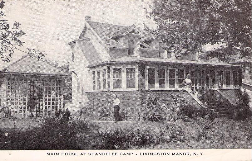 - Livingston Manor 1908 Doane 5 on post card; 1946 machine cancel on post card, B&W view “Main House at Shandelee Camp”