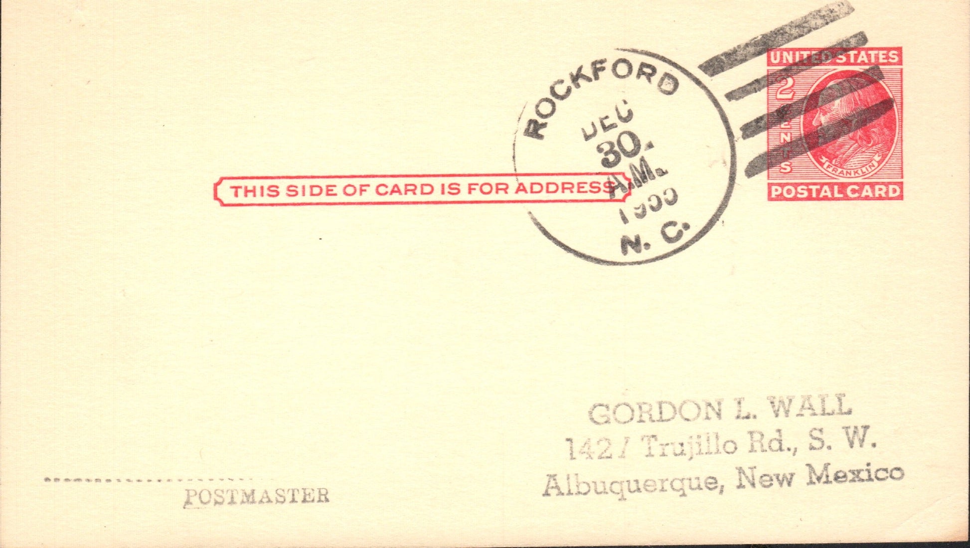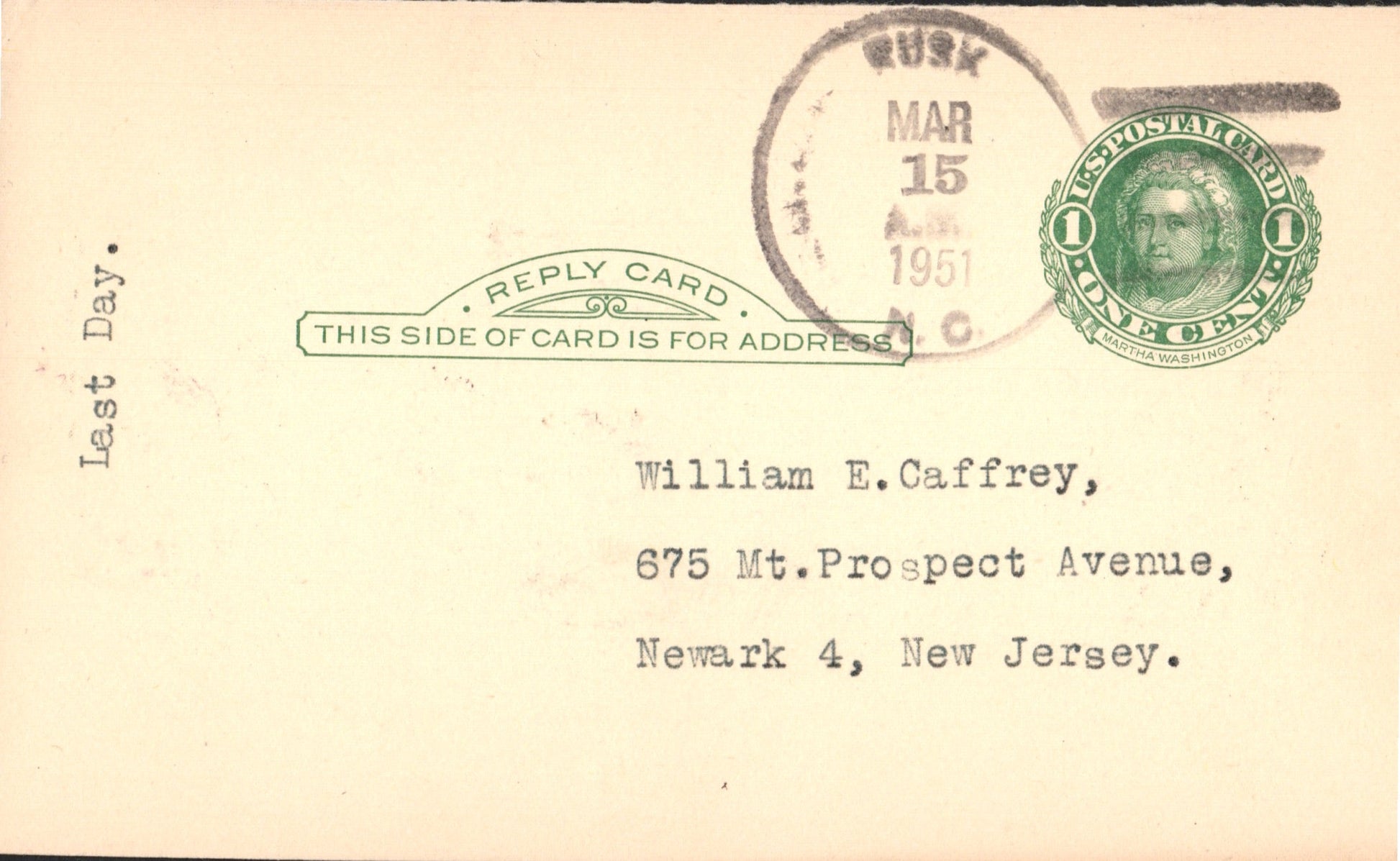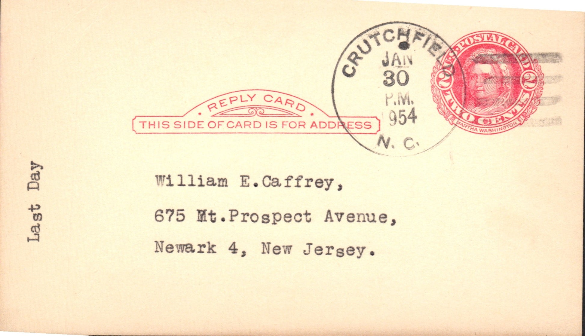 Crutchfield (1890-1954) 1954 4-bar on LD Postal Card