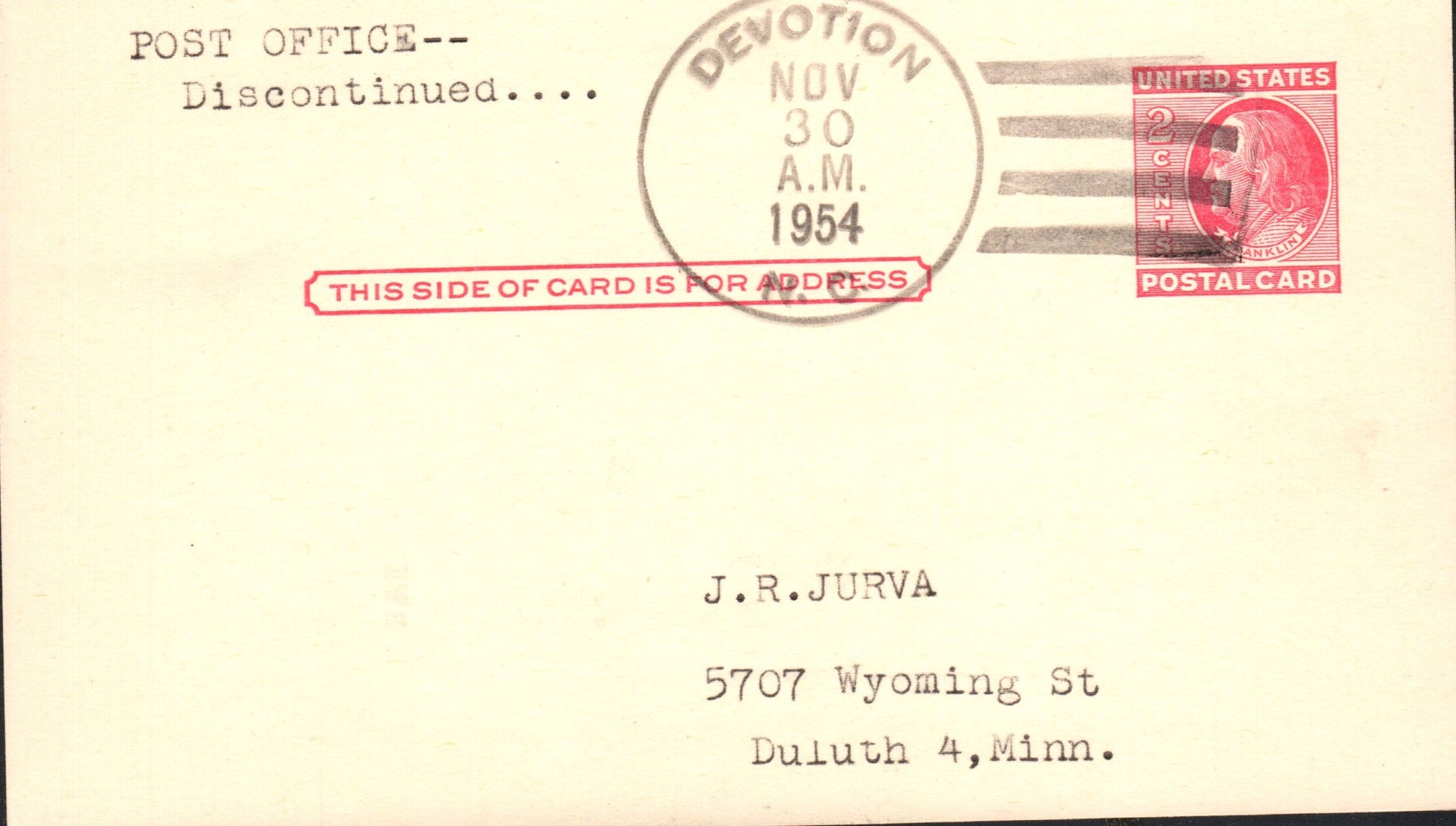 Devotion (1888-1954) 1954 4-bar on Postal Card