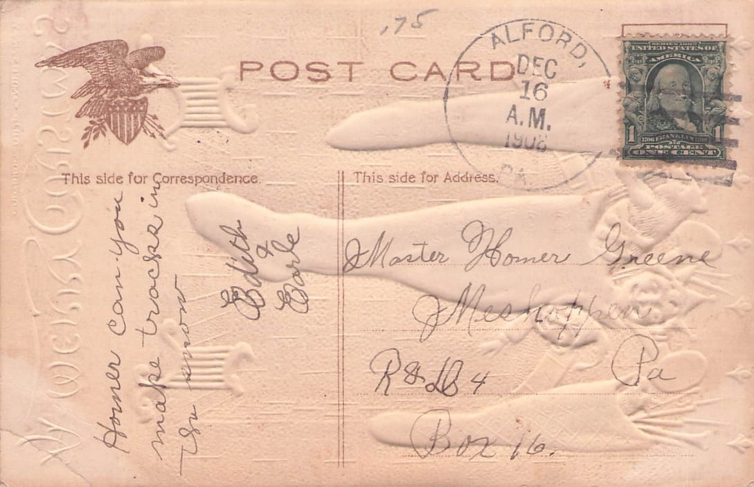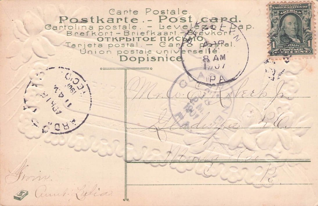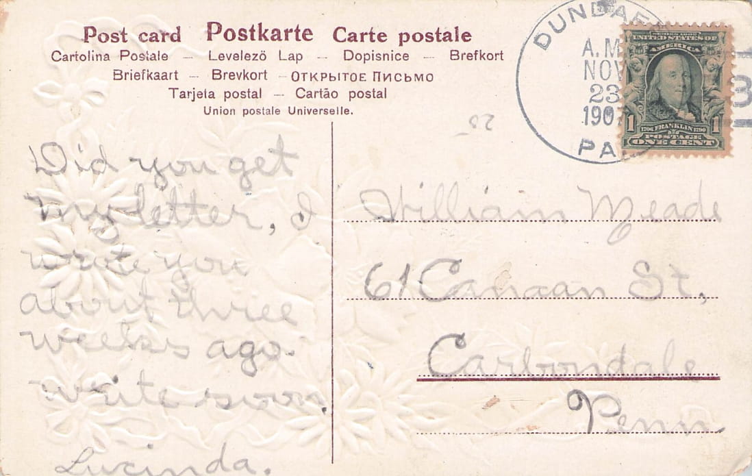 Gelatt (1878-1969) 1907 Doane as Rec’d mark on post card from Scranton; 1922 4-bar on post card