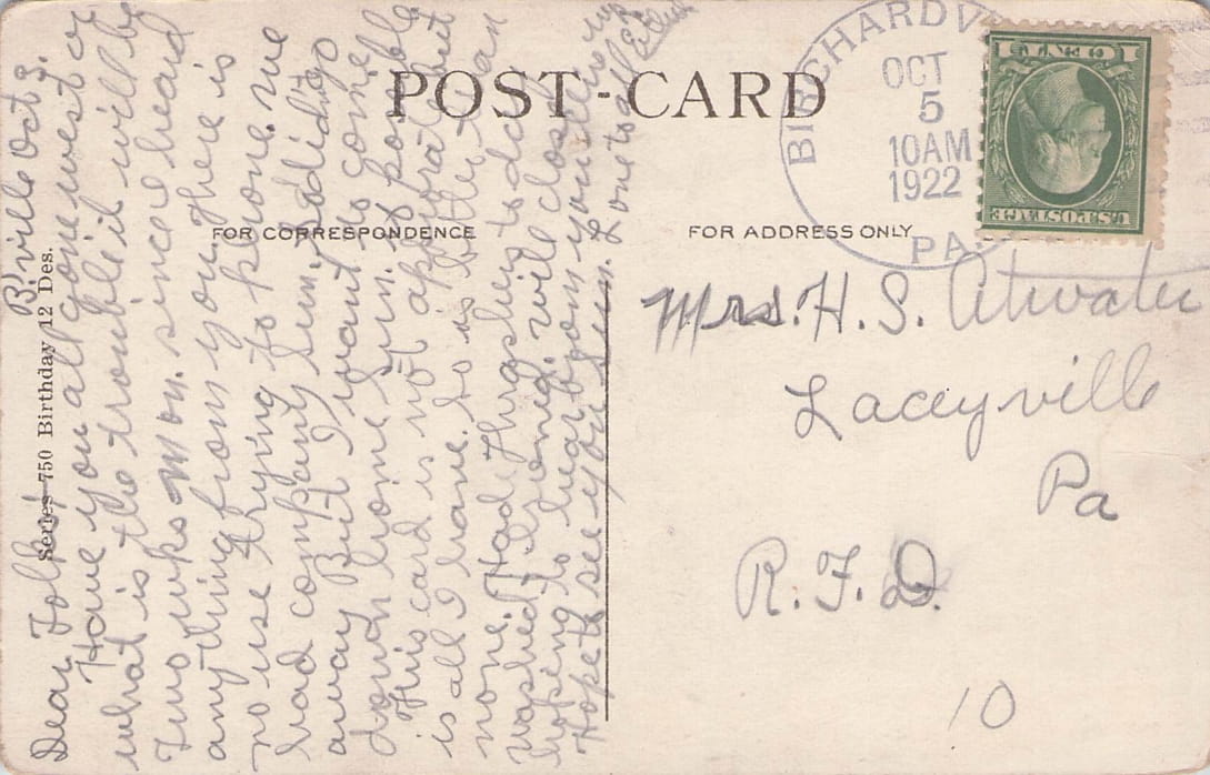 Birchardville (1825-1954) 1909 4-bar on cover; 1922 4-bar [serif letters] on post card; 1954 4-bar on LD Postal Card