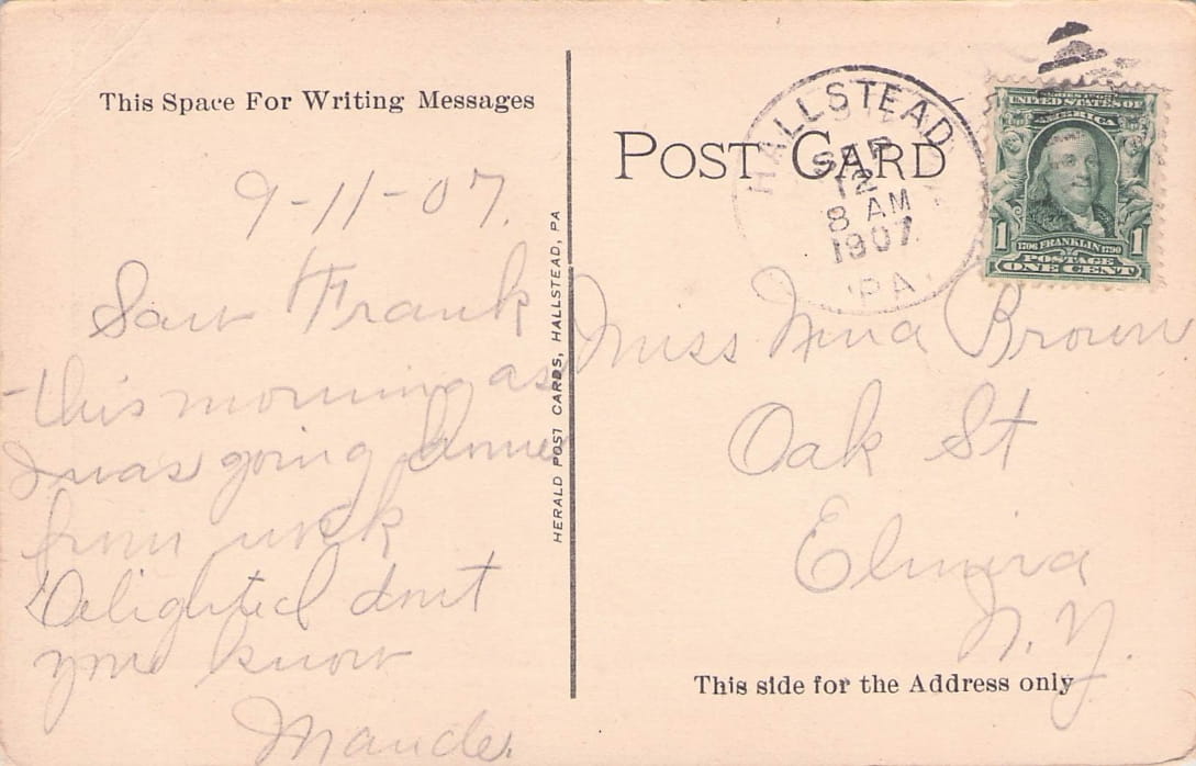Hallstead 1907 duplex on post card, view of Hallstead & Great Bend Water Co. reservoir