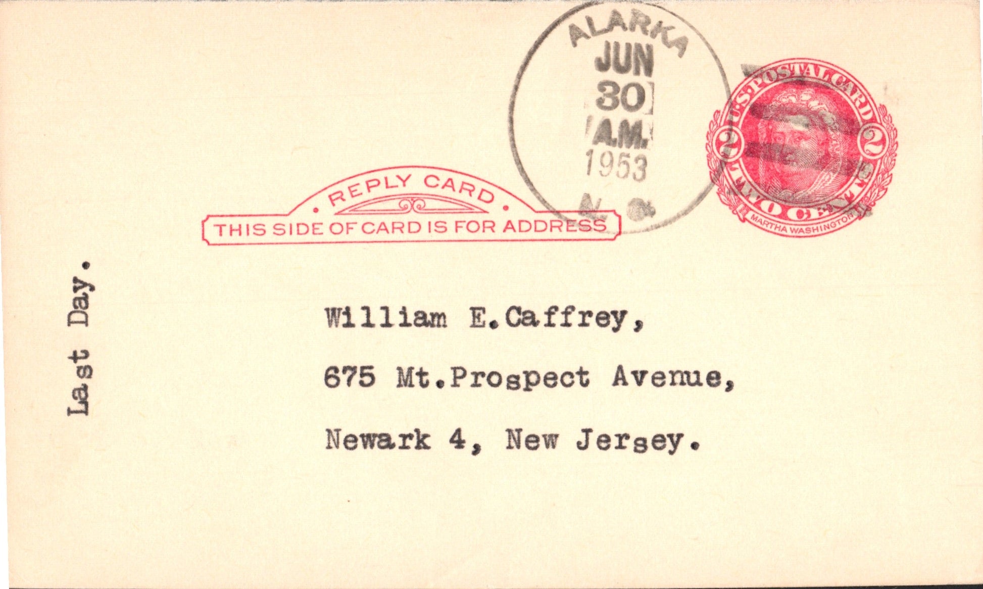 - Alarka (1915-1953) 1953 4-bar on LD Postal Card