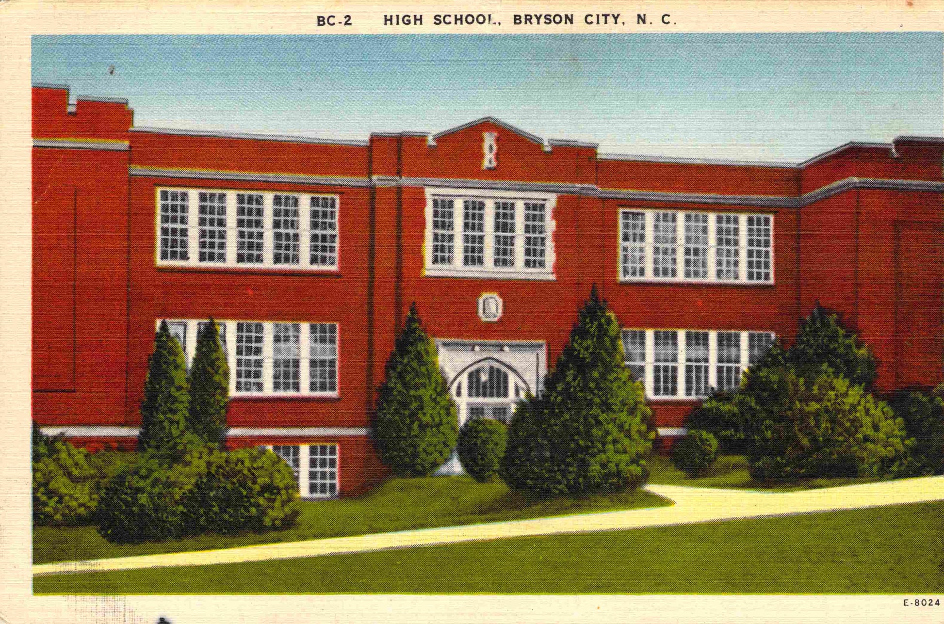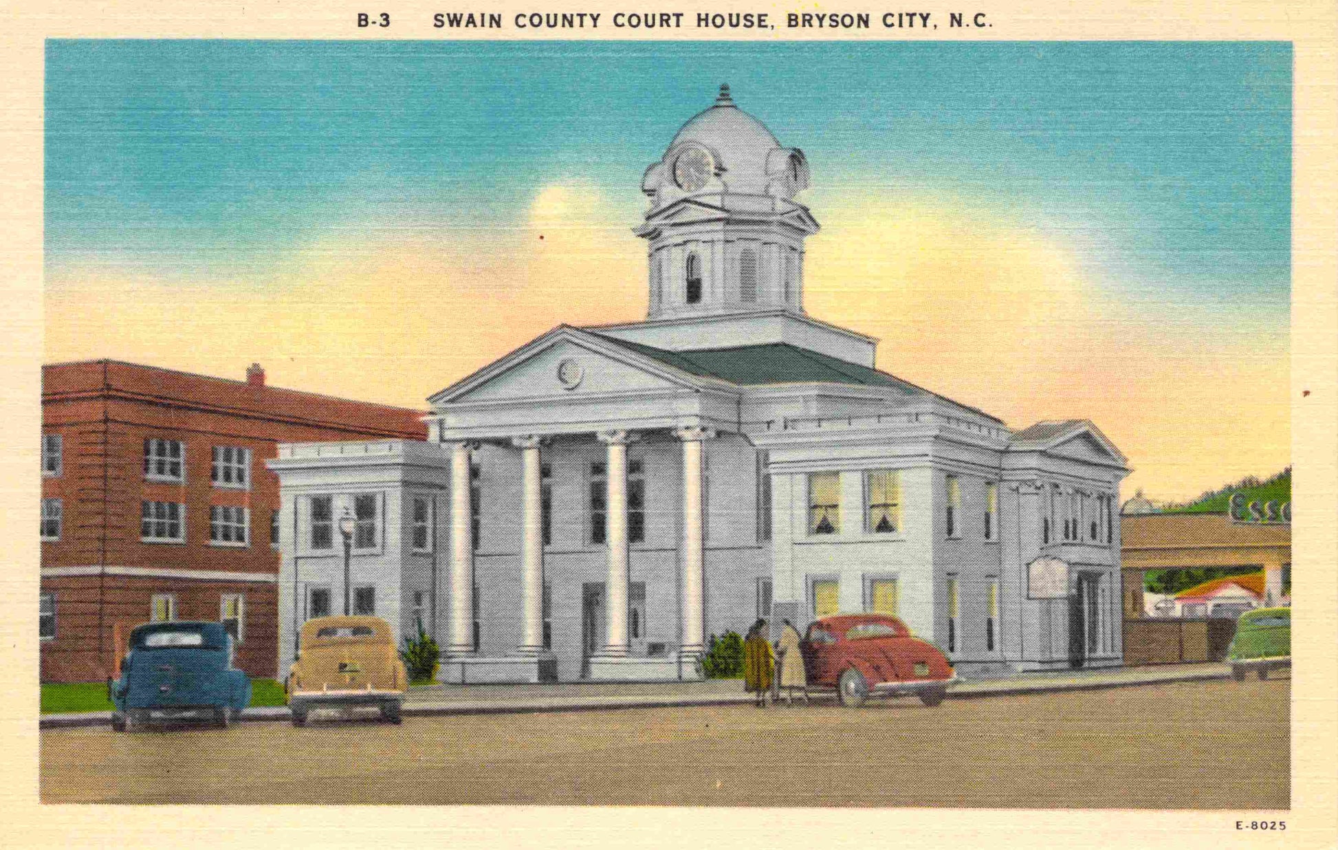 - Post cards: Myers Court [chrome], Swain Co. Court House [linen]; High School [linen, slightly trimmed]; Laurel Falls [linen]