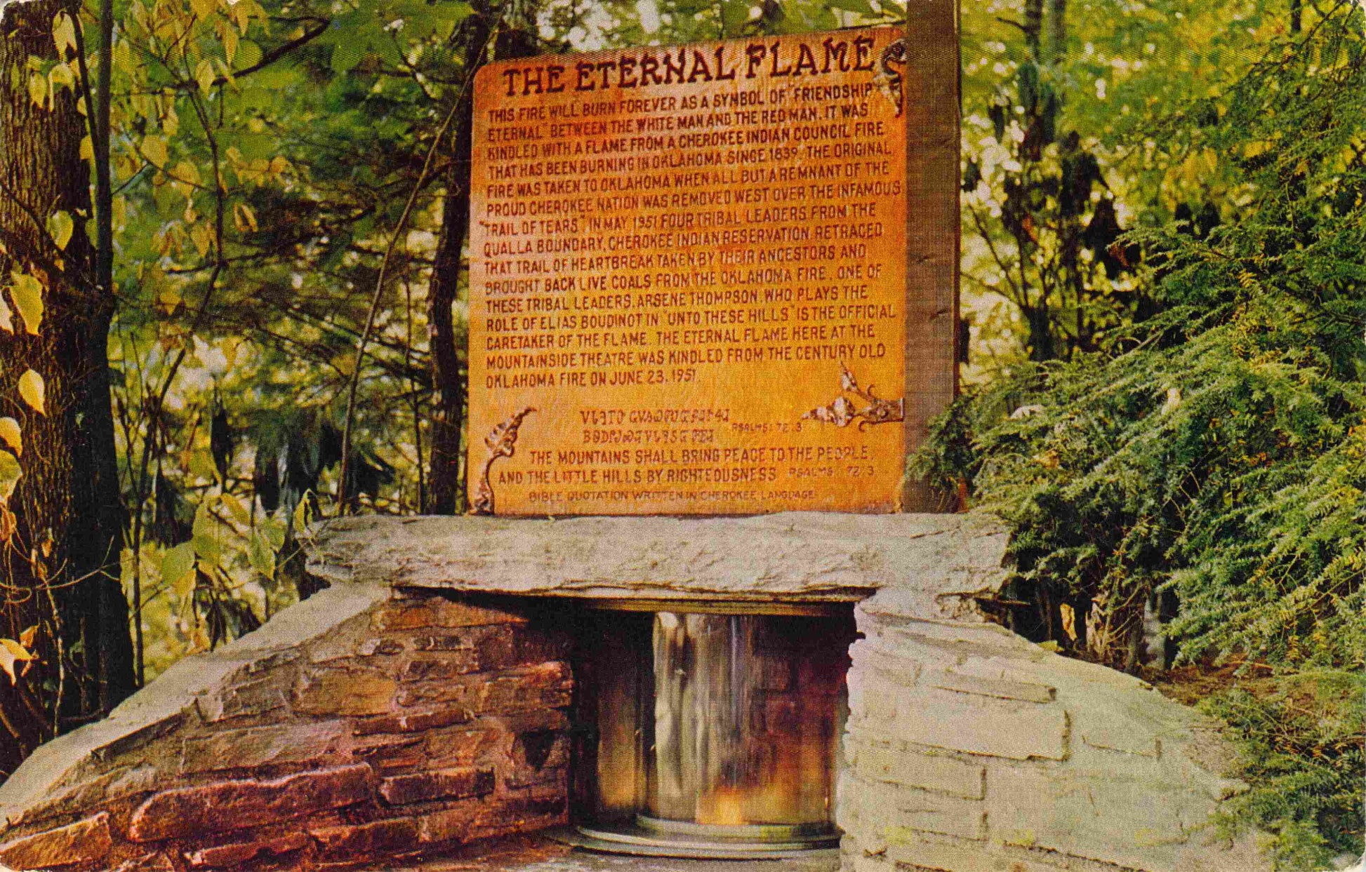 - Post cards: Aerial view [chrome]; Cherokee by moonlight [linen]; Newfound Lodge [chrome]; Mountainside Theater [linen]; Eternal Flame [chrome]; Indians [2, one linen, one chrome]