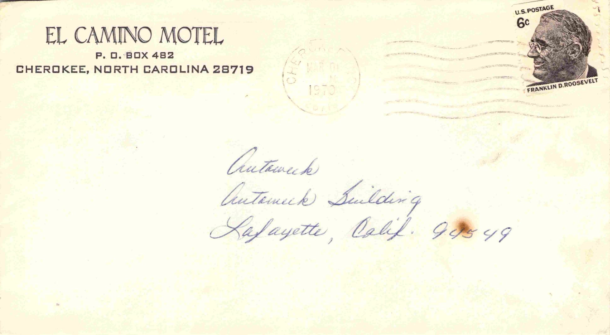 - Cherokee light 1970 machine cancel, “El Camino Motel” corner.