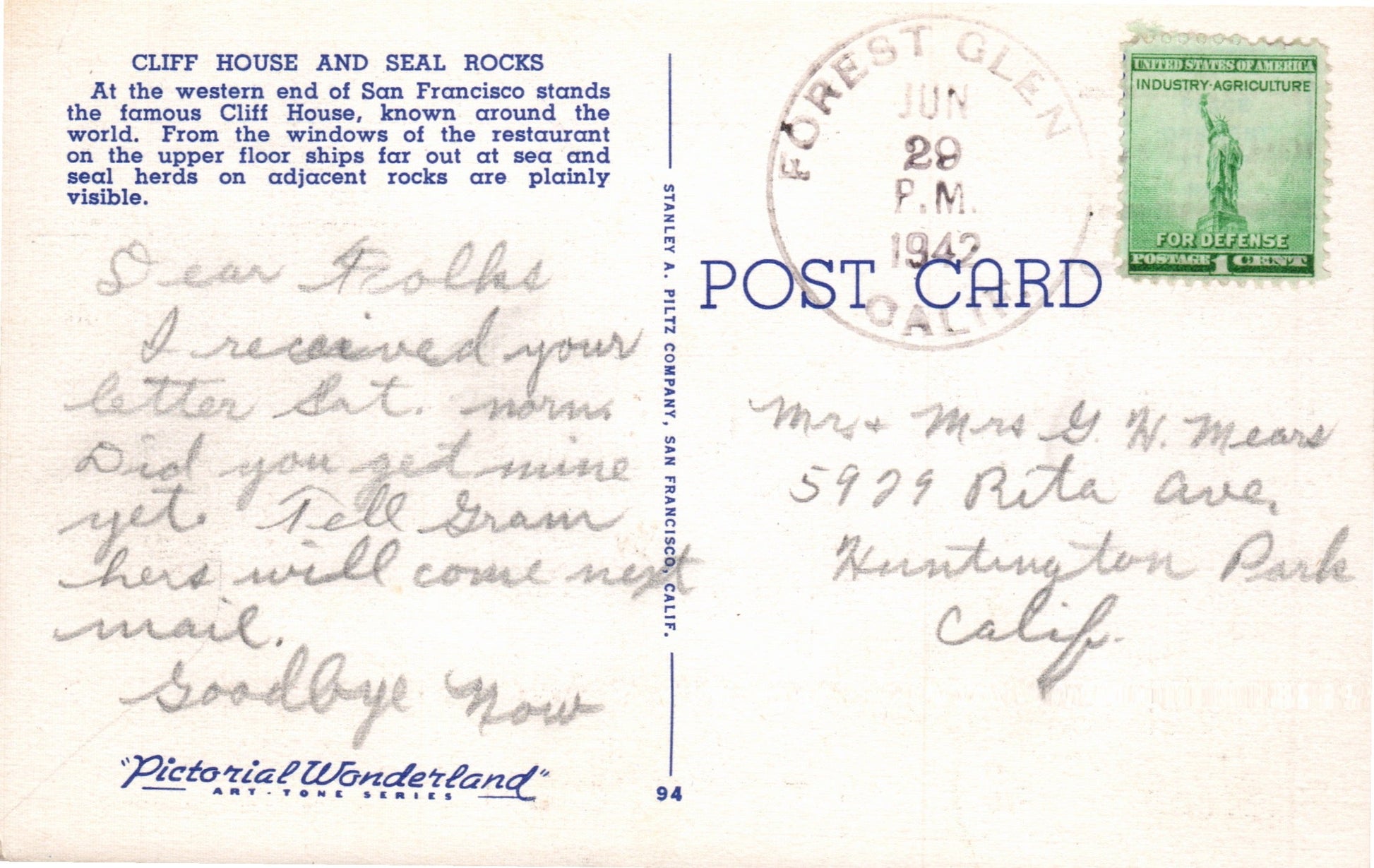 Forest Glen (1920-1967) 1942 4-bar on post card; 1966 4-bar on cover