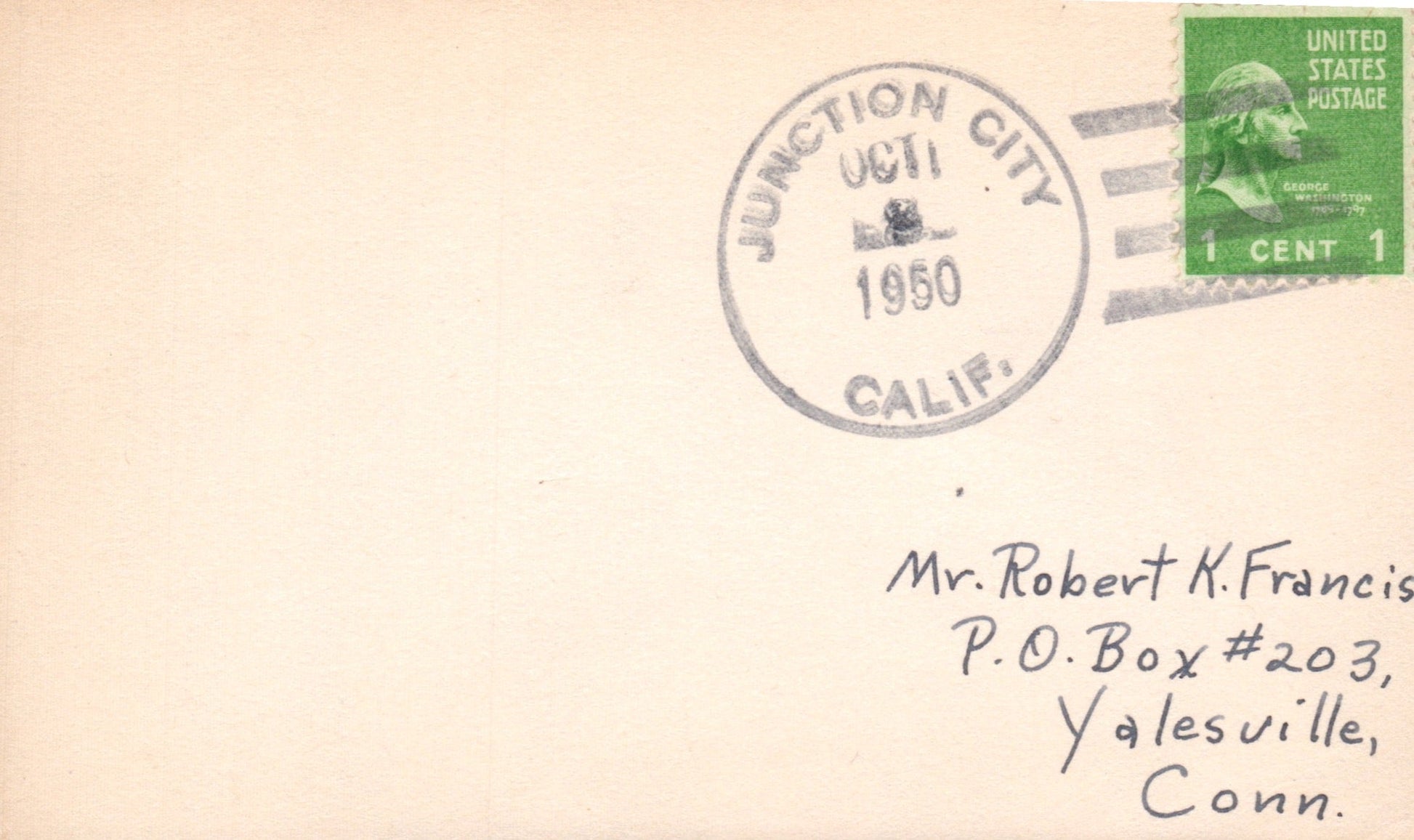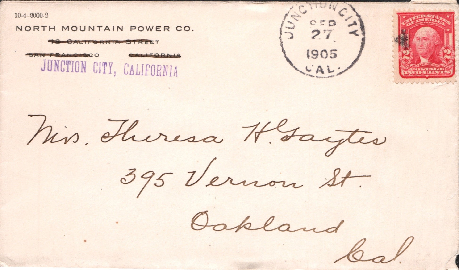 Junction City 1905 cds on cover, “North Mountain Power Co.” corner; 1950 4-bar on 3x5 card