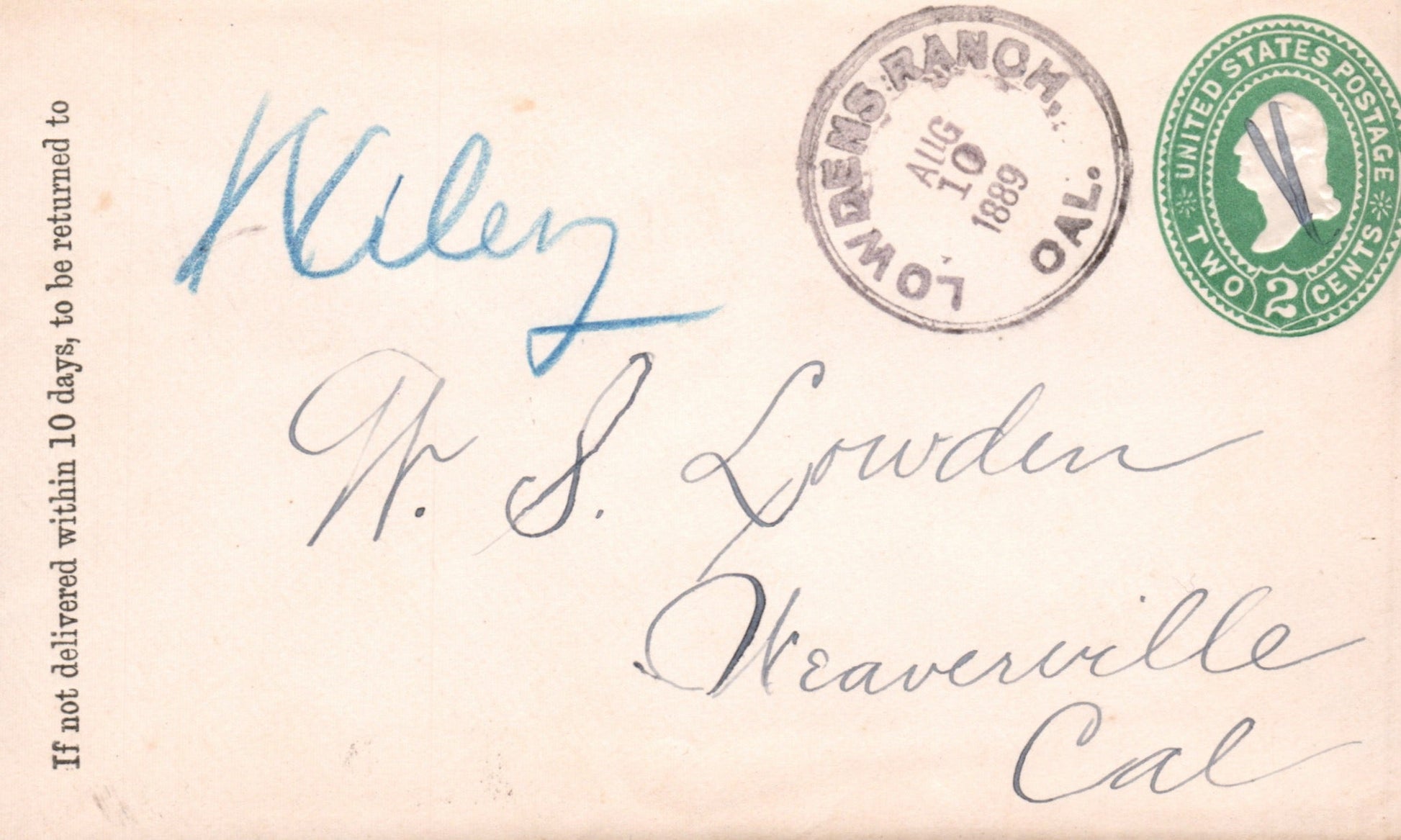 Lowdens Ranch (1874-1908) 1889 double-circle cds on cover, Weaverville cds & target killer on back