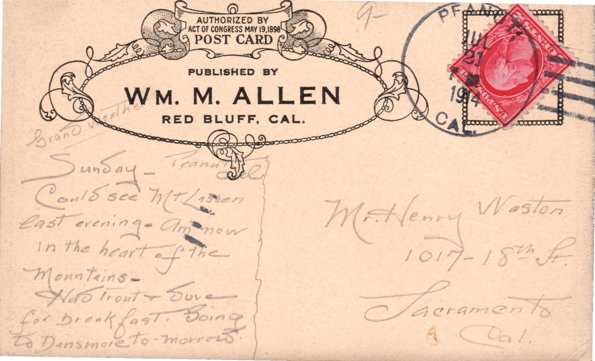 Peanut (1900-1933) 1914 4-bar on real photo post card, “Mt. Lassen in eruption”