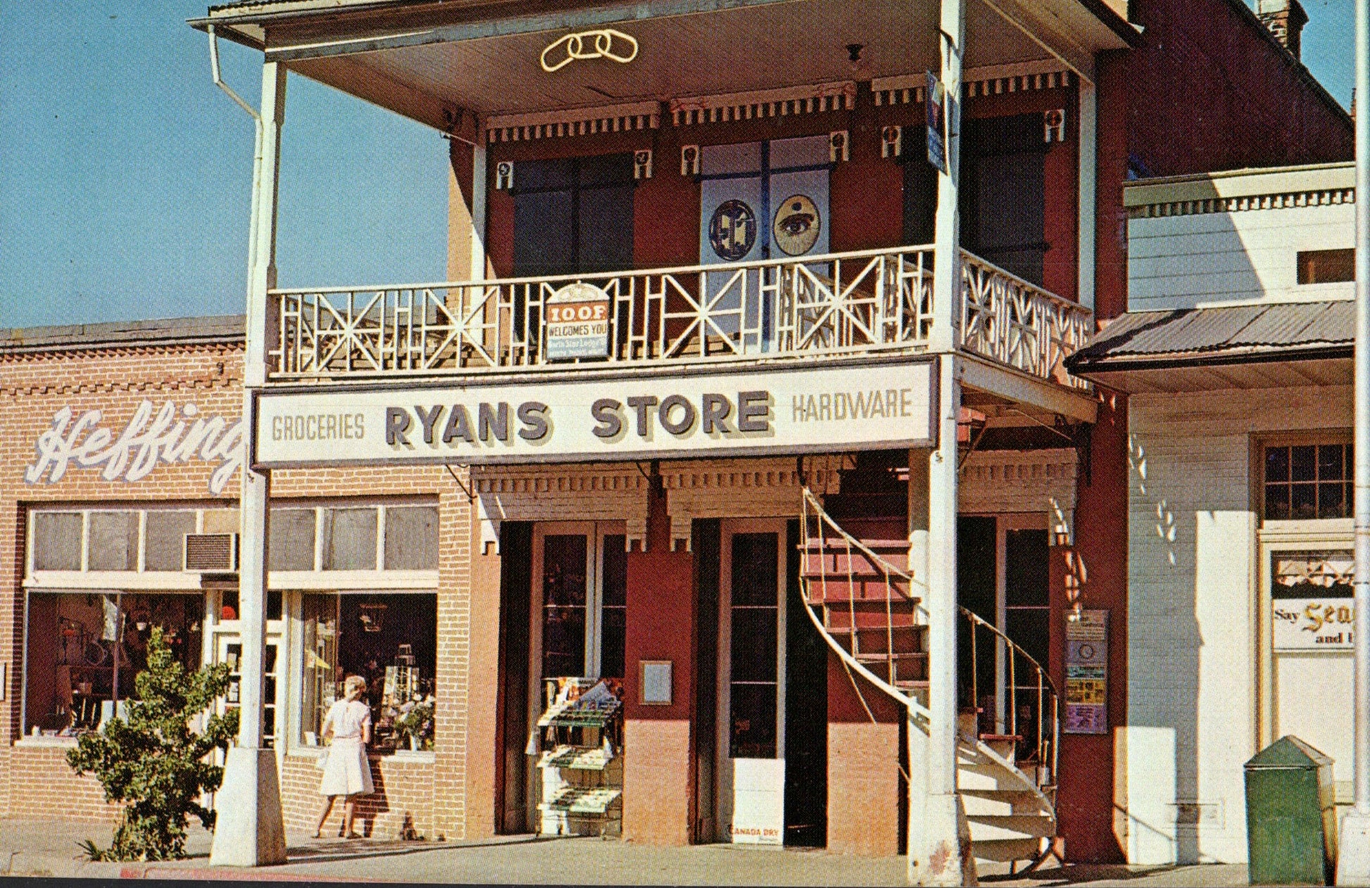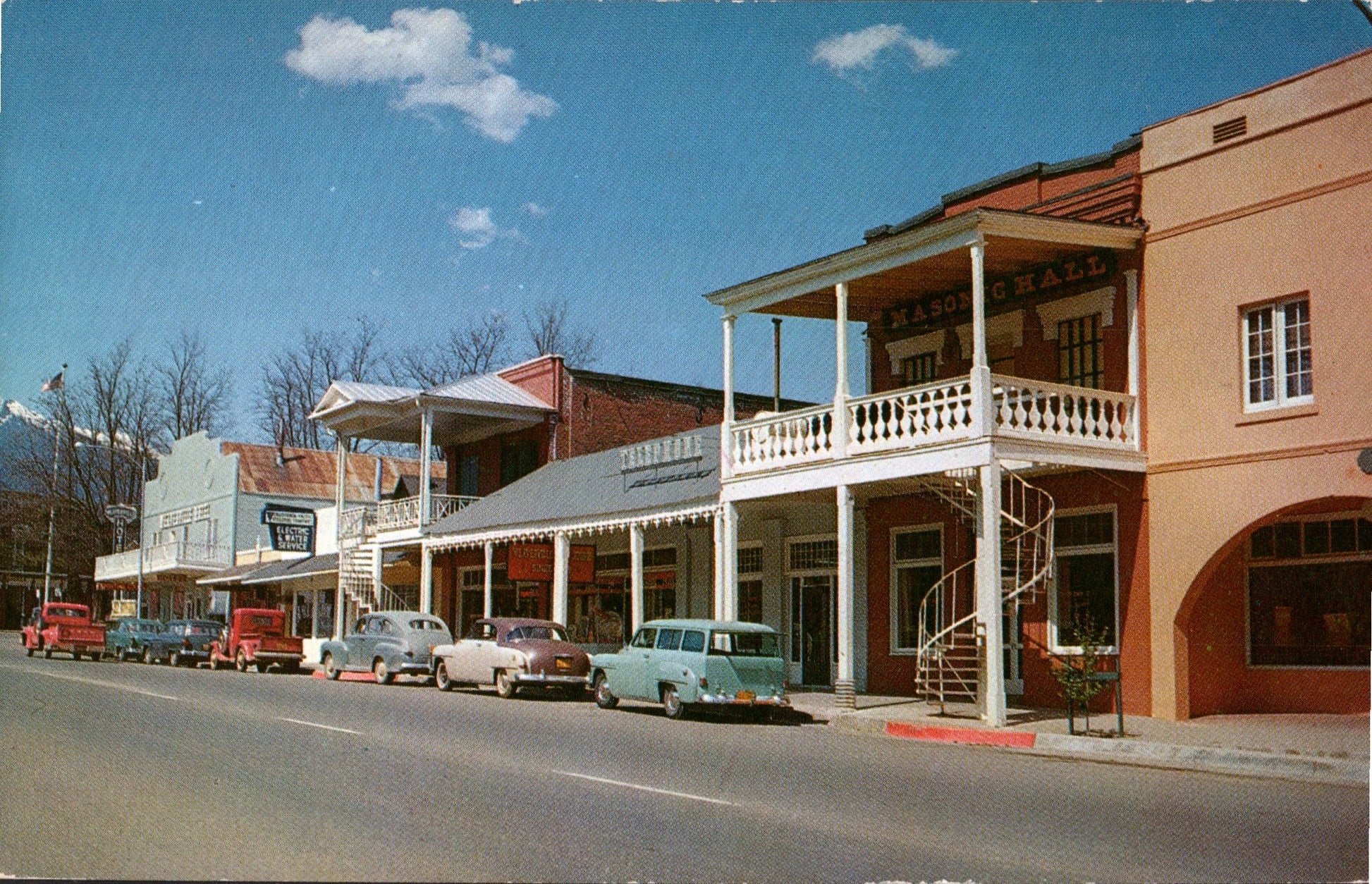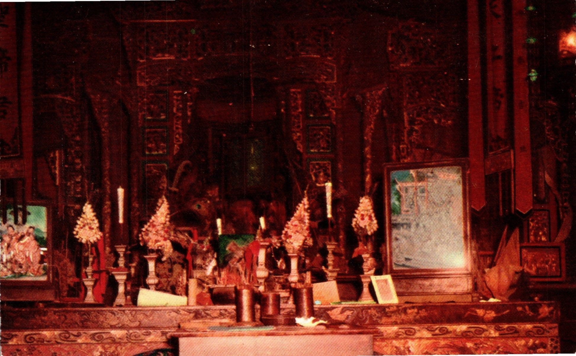 Weaverville Post cards: Main street [chrome, c.1955]; Main street buildings, c.1950 [chrome]; Ryan’s Store & Odd Fellows Hall [chrome]; “Jackson Memorial Museum” [chrome]; Joss House interior [chrome]