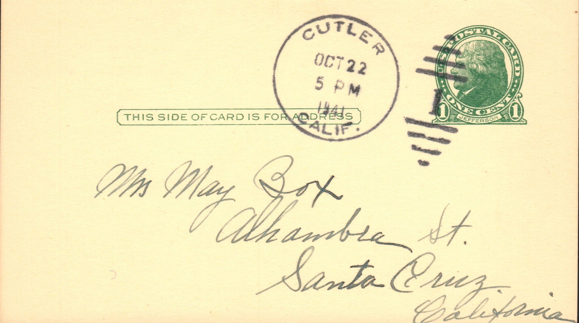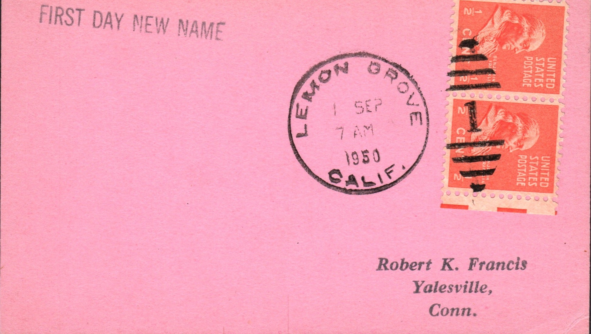 Lemoncove 1910 4-bar on post card; 1941 machine cancel on “Registered Article” receipt; 1950 duplex on 3x5 card as P.O. name officially changed from one word to two