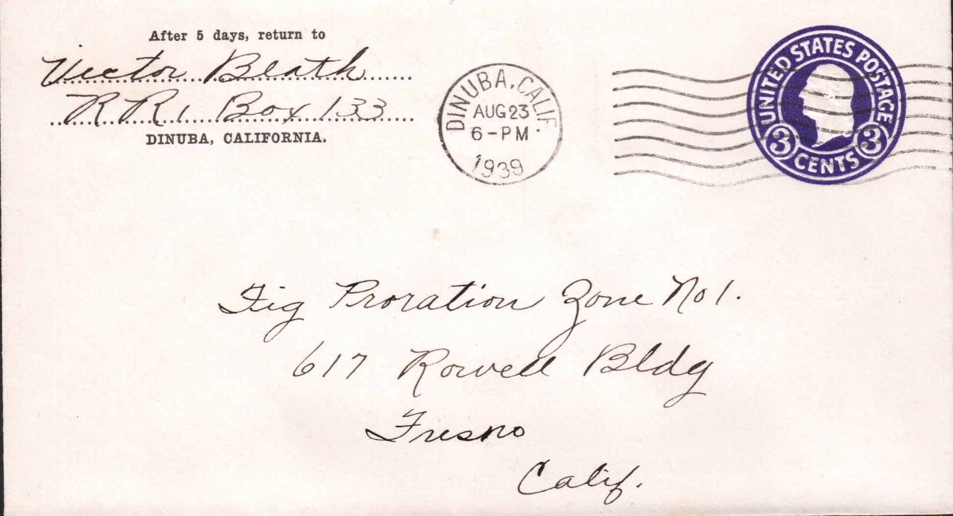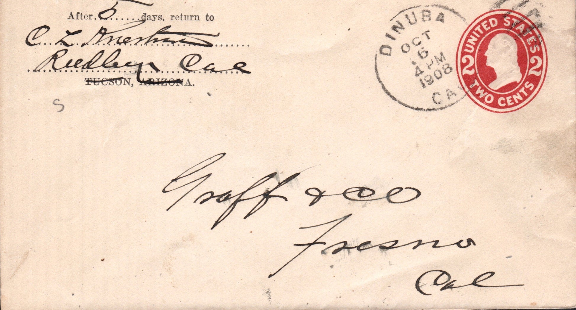 Dinuba 1908 duplex on cover; 1939 machine cancel on cover; 1971 machine cancel on cover