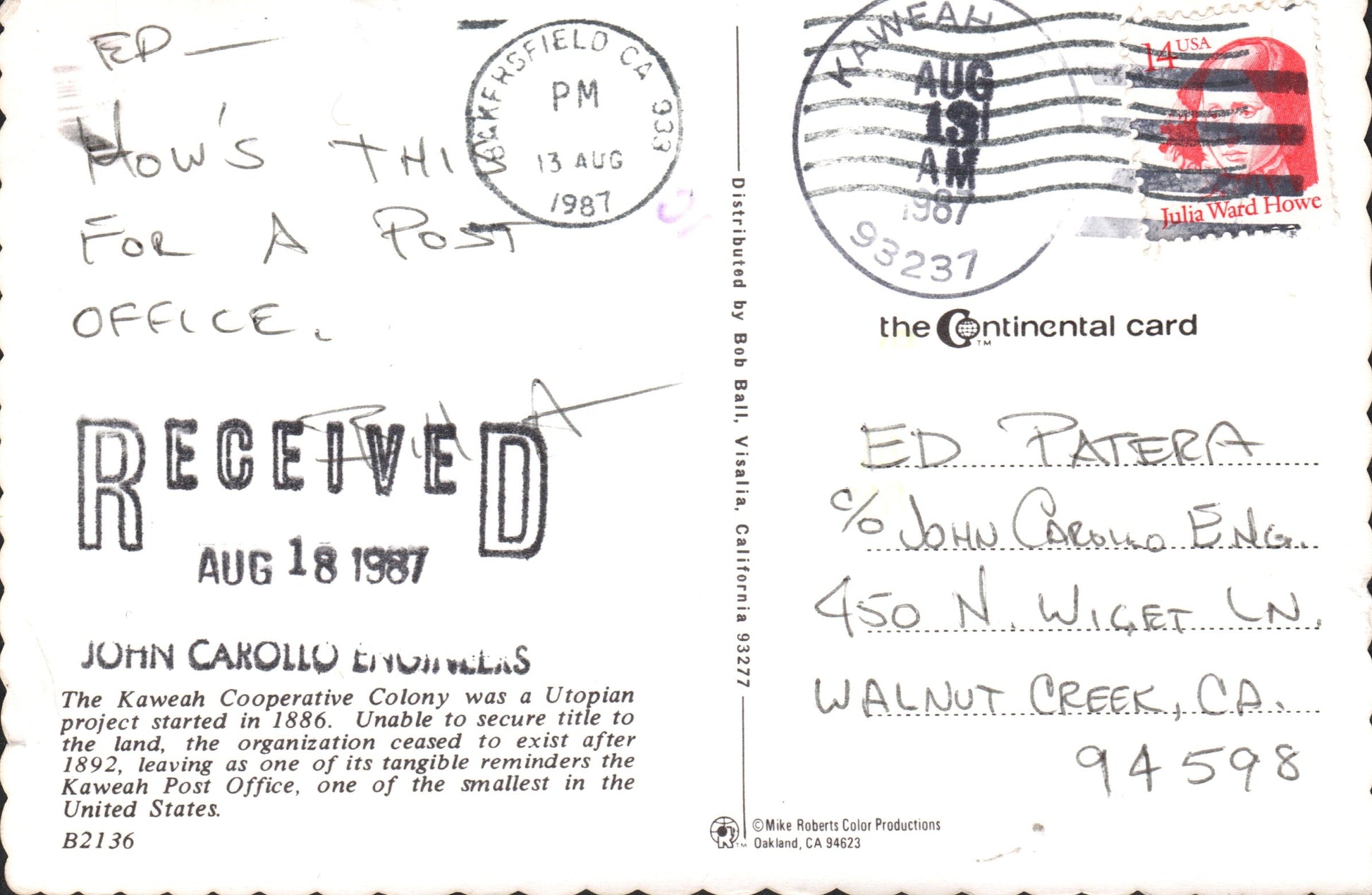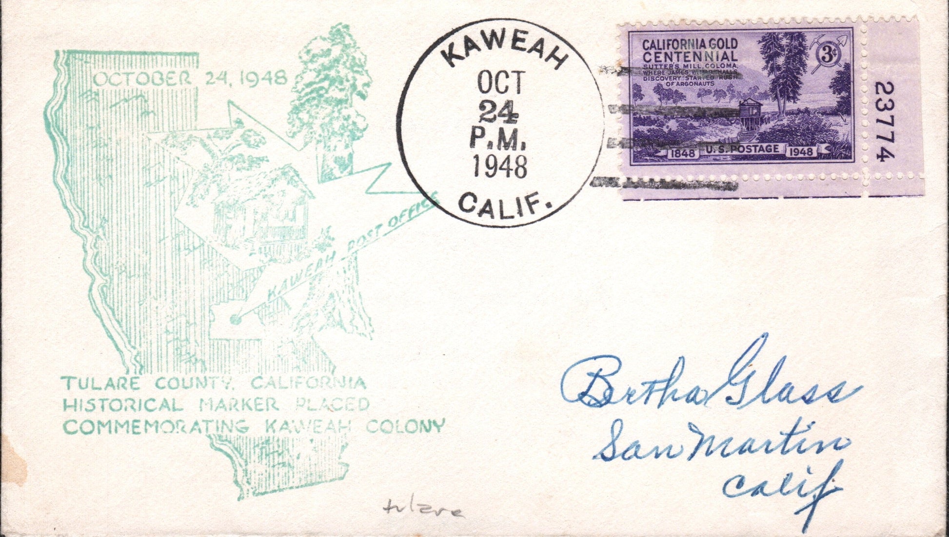 Kaweah 1948 4-bar on cacheted cover, “Historical Marker Placed Commemorating Kaweah Colony”; 1987 4-bar on post card (view of Kaweah post office) overstruck Bakersfield