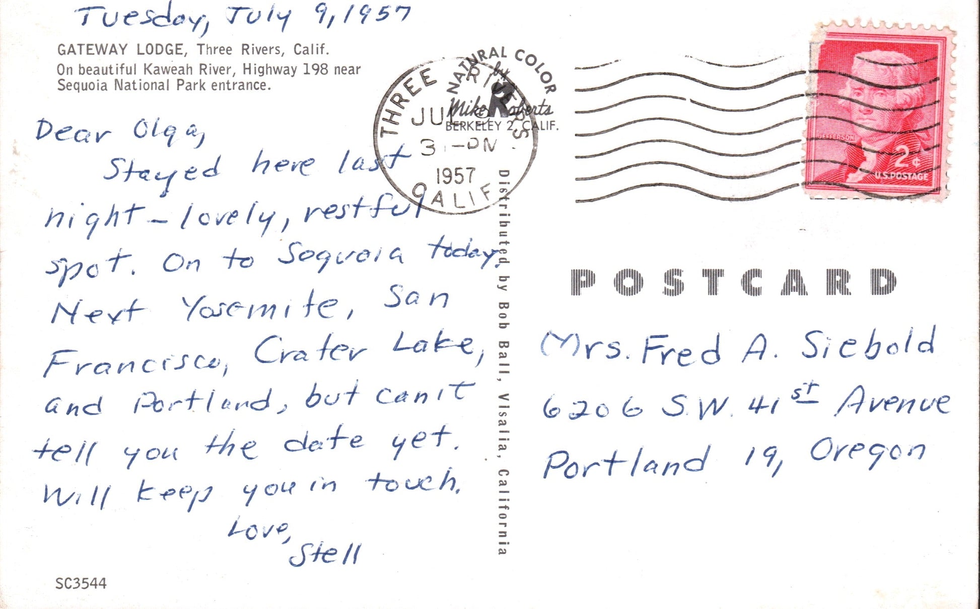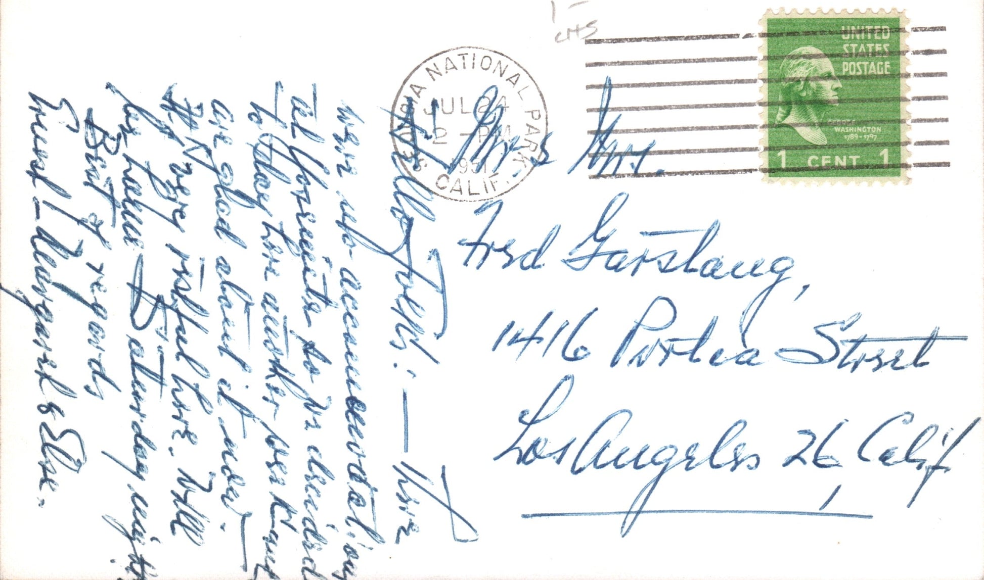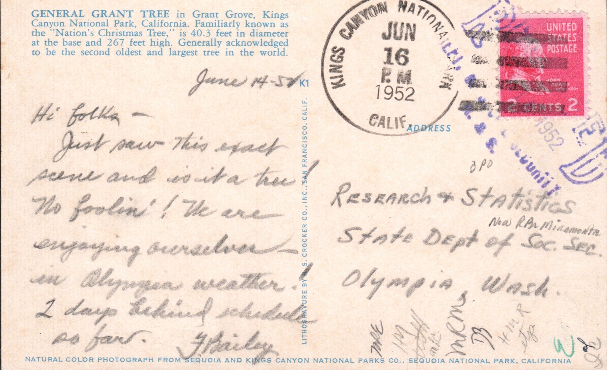 Kings Canyon National Park 1952 4-bar on post card 1957; 4-bar on 3x5 card