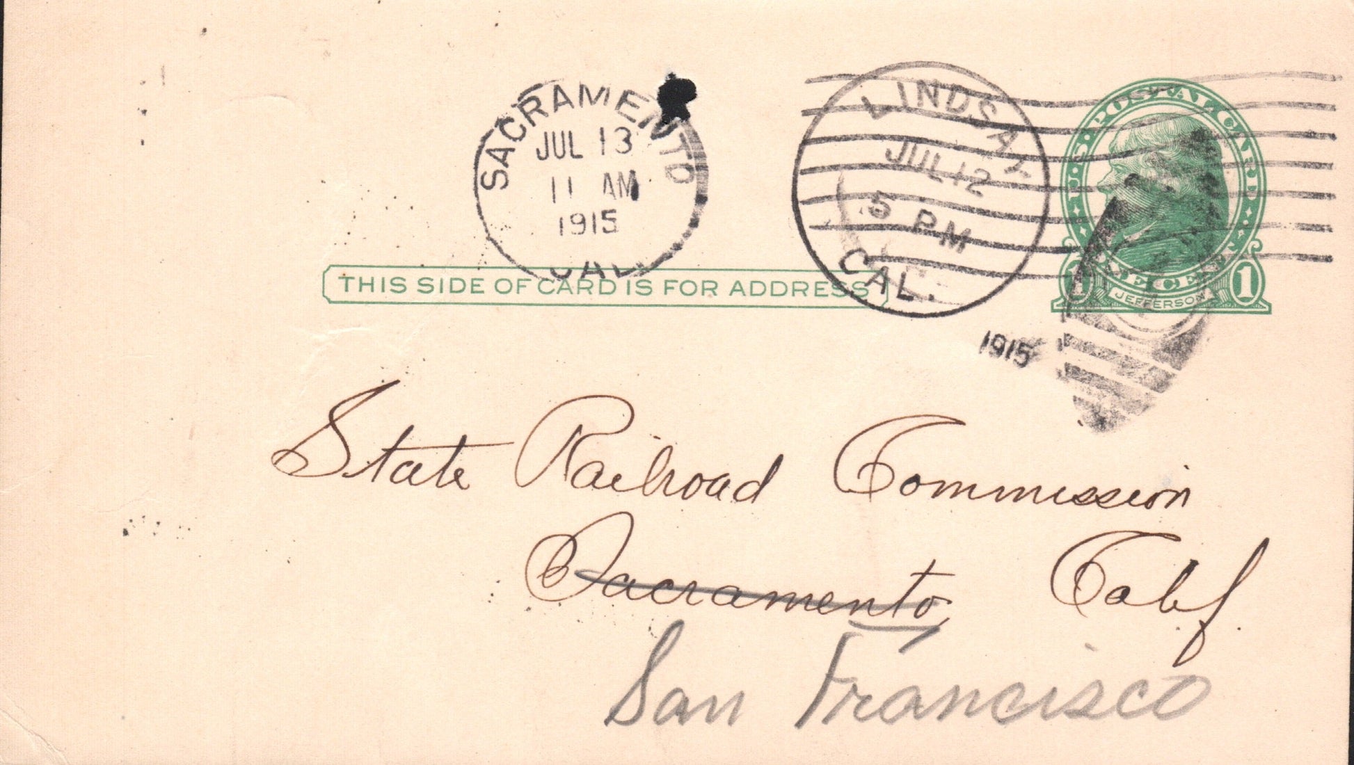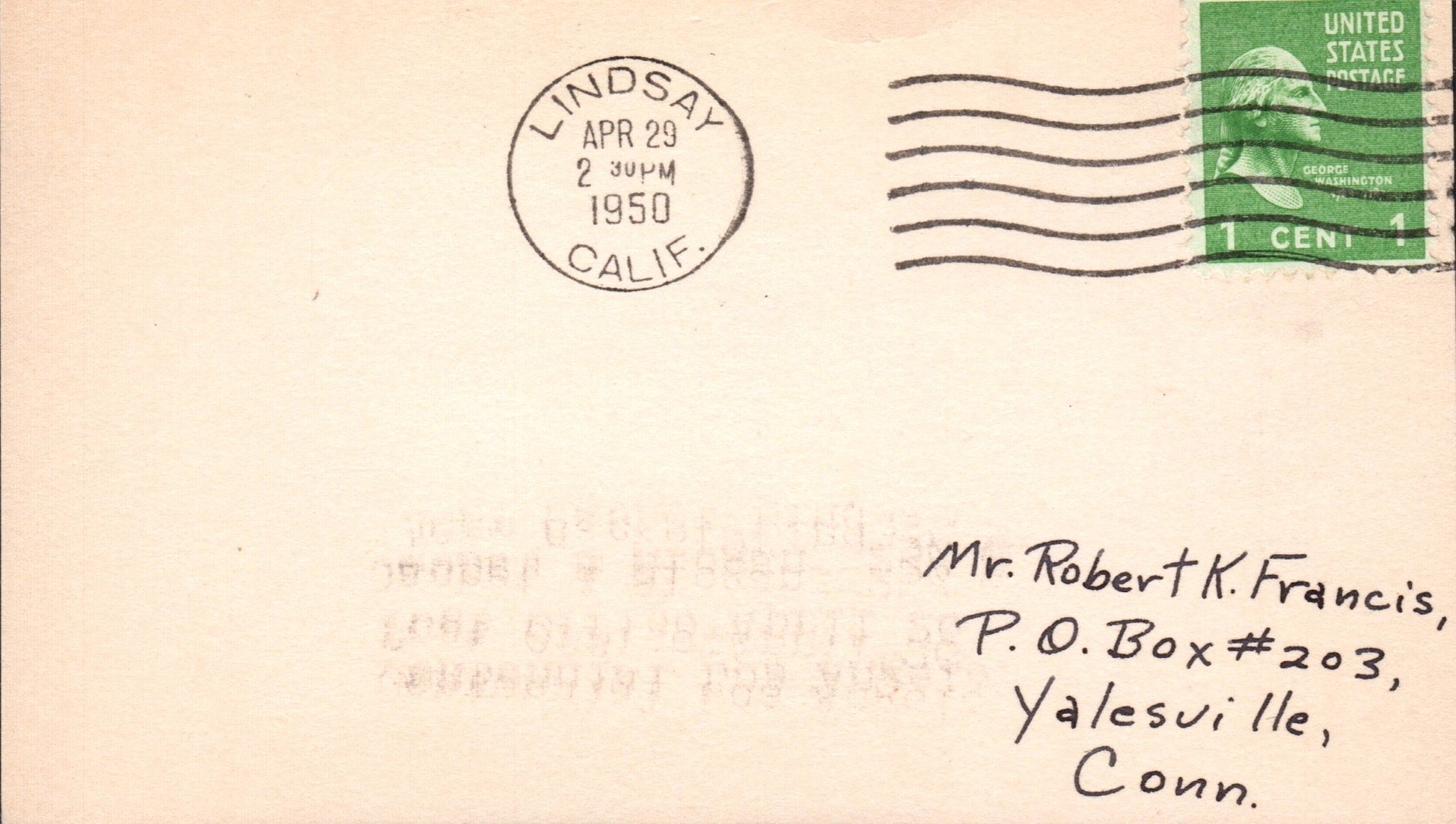 Lindsay 1914 duplex on Postal Card; 1915 date-out duplex on Postal Card, overstruck Sacramento and hole punched; 1950 machine cancel on 3x5 card