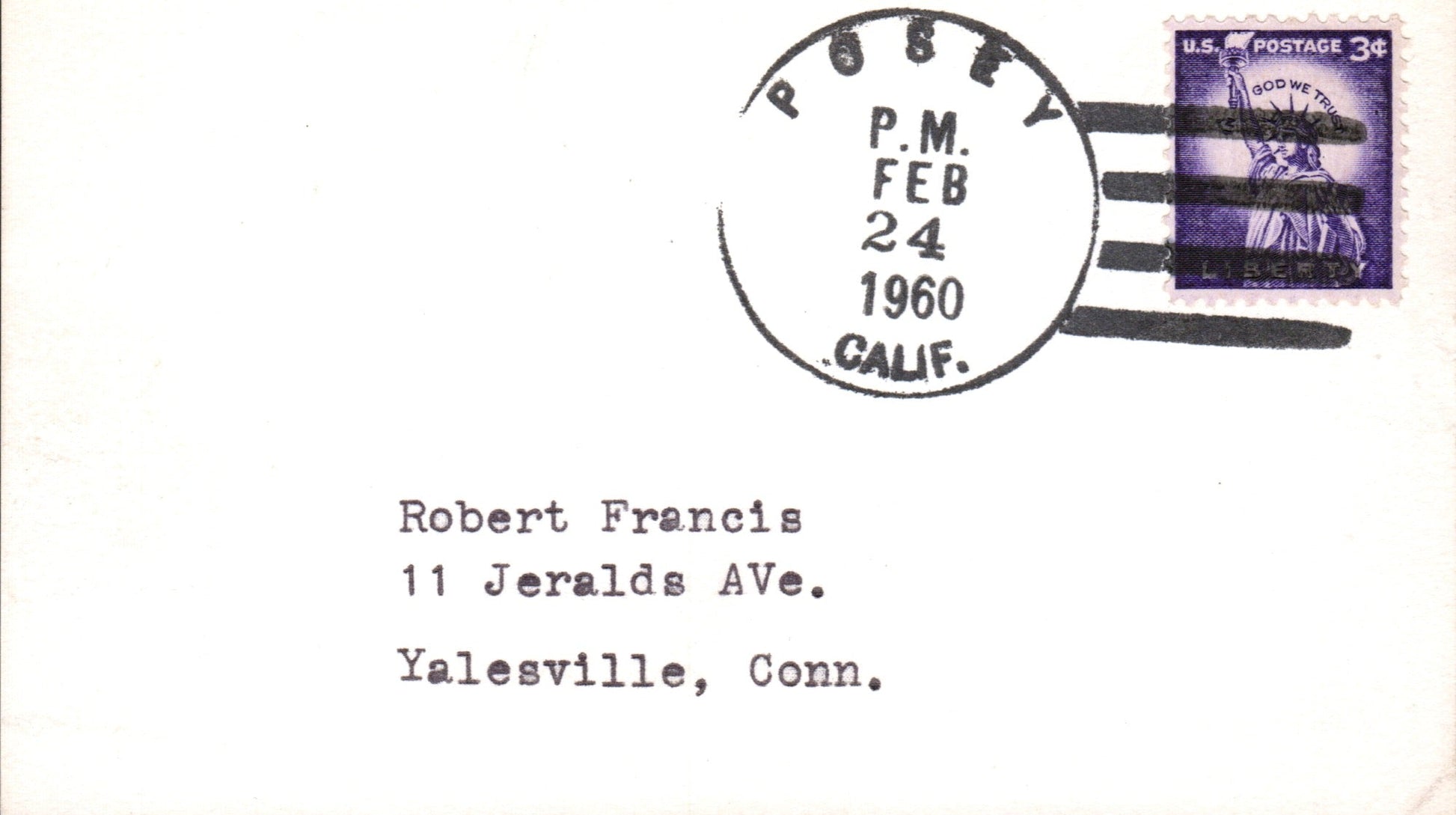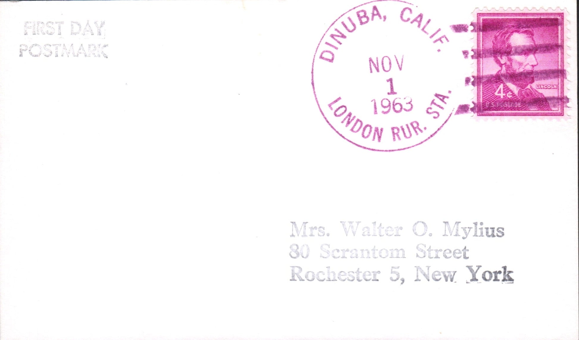 London RS (Dinuba) (1963-dpo) 1963 4-bar on 3x5 card, FD of postal status