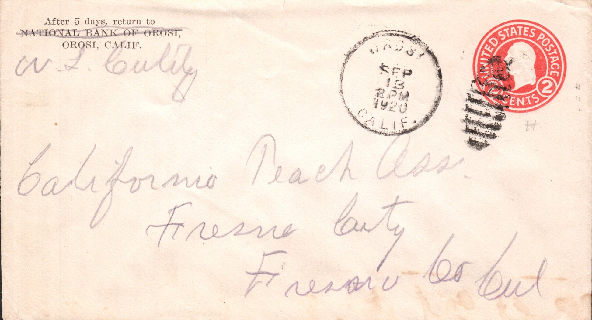 Orosi poor 1920 duplex on cover, “National Bank of Orosi” corner