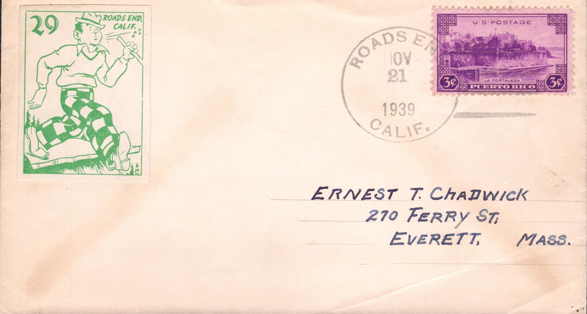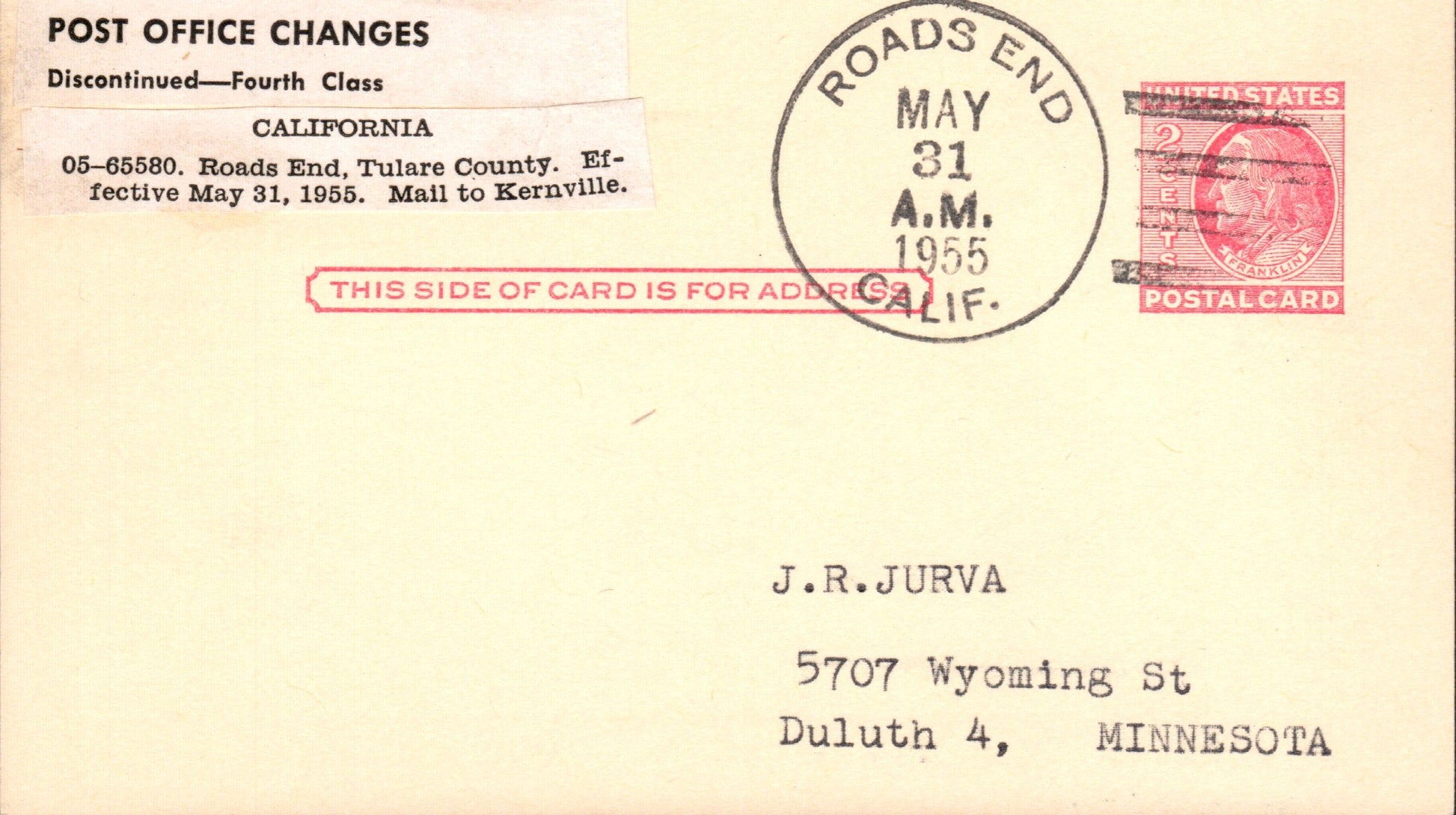 Roads End (1936-1955) 1939 4-bar on cacheted cover; 1955 4-bar on LD Postal Card