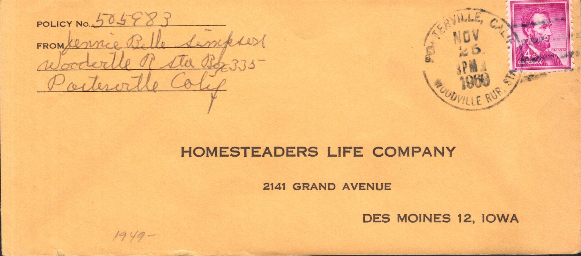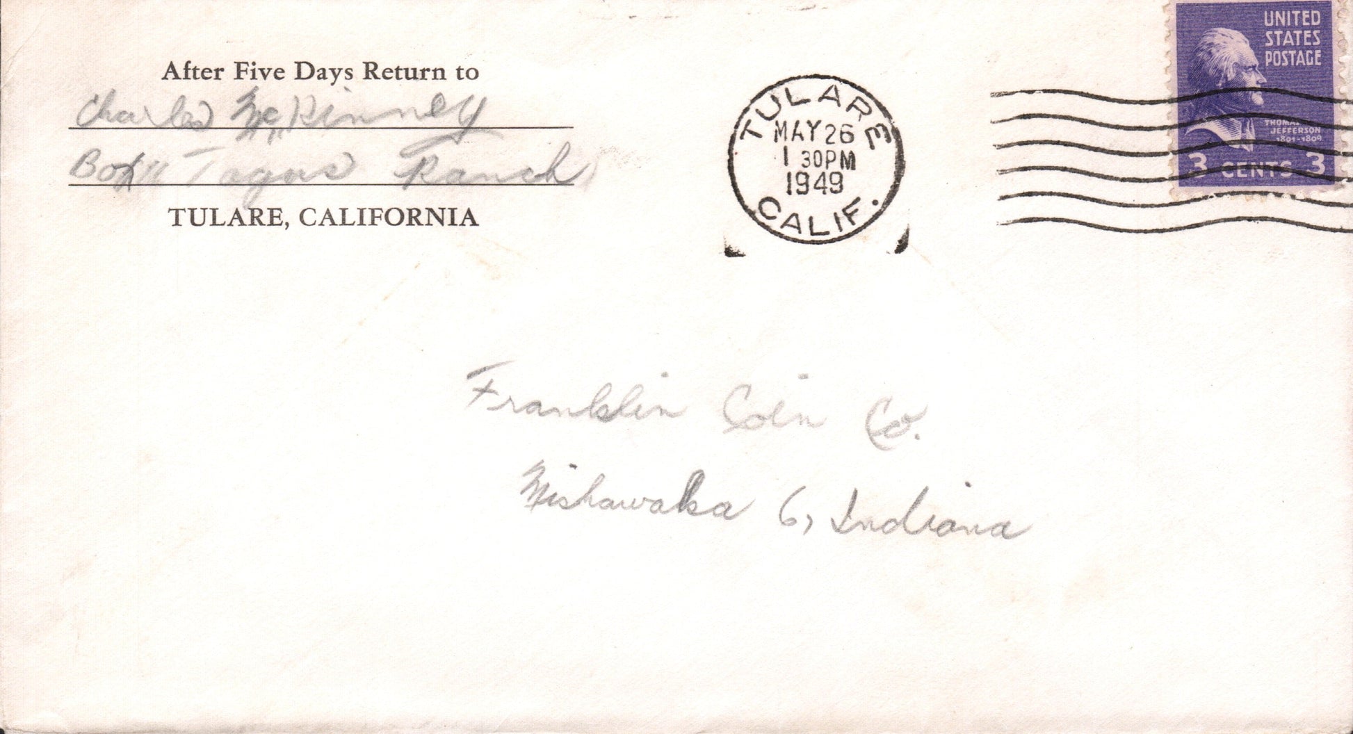 Tulare 1909 date-out duplex on post card; 1949 machine cancel on cover
