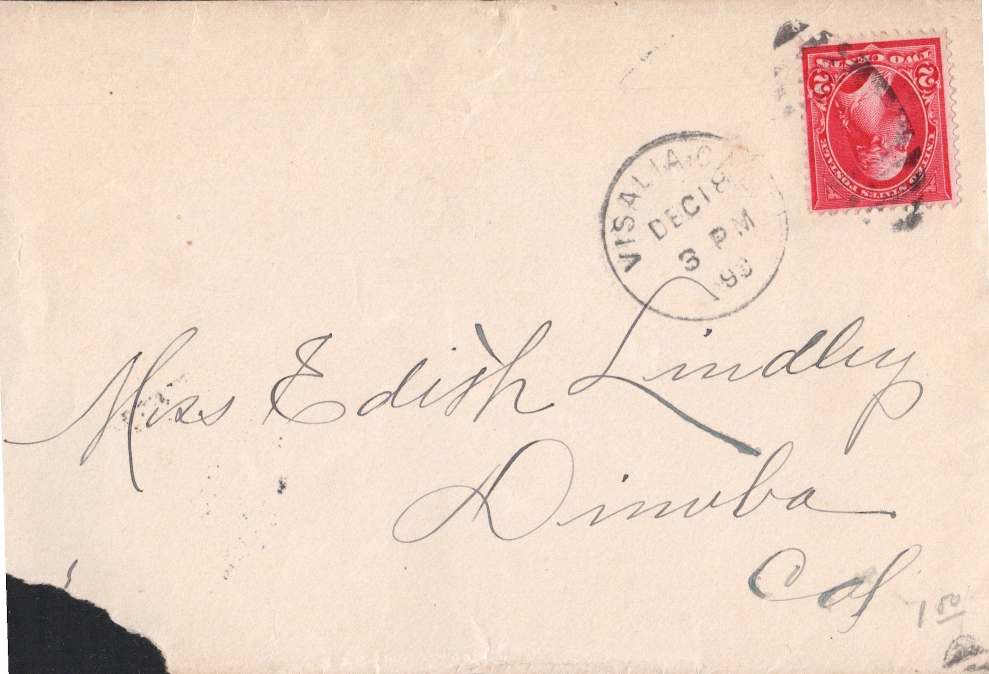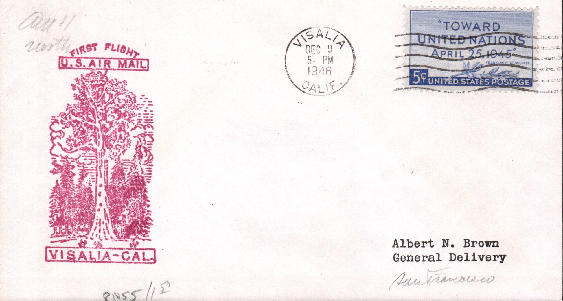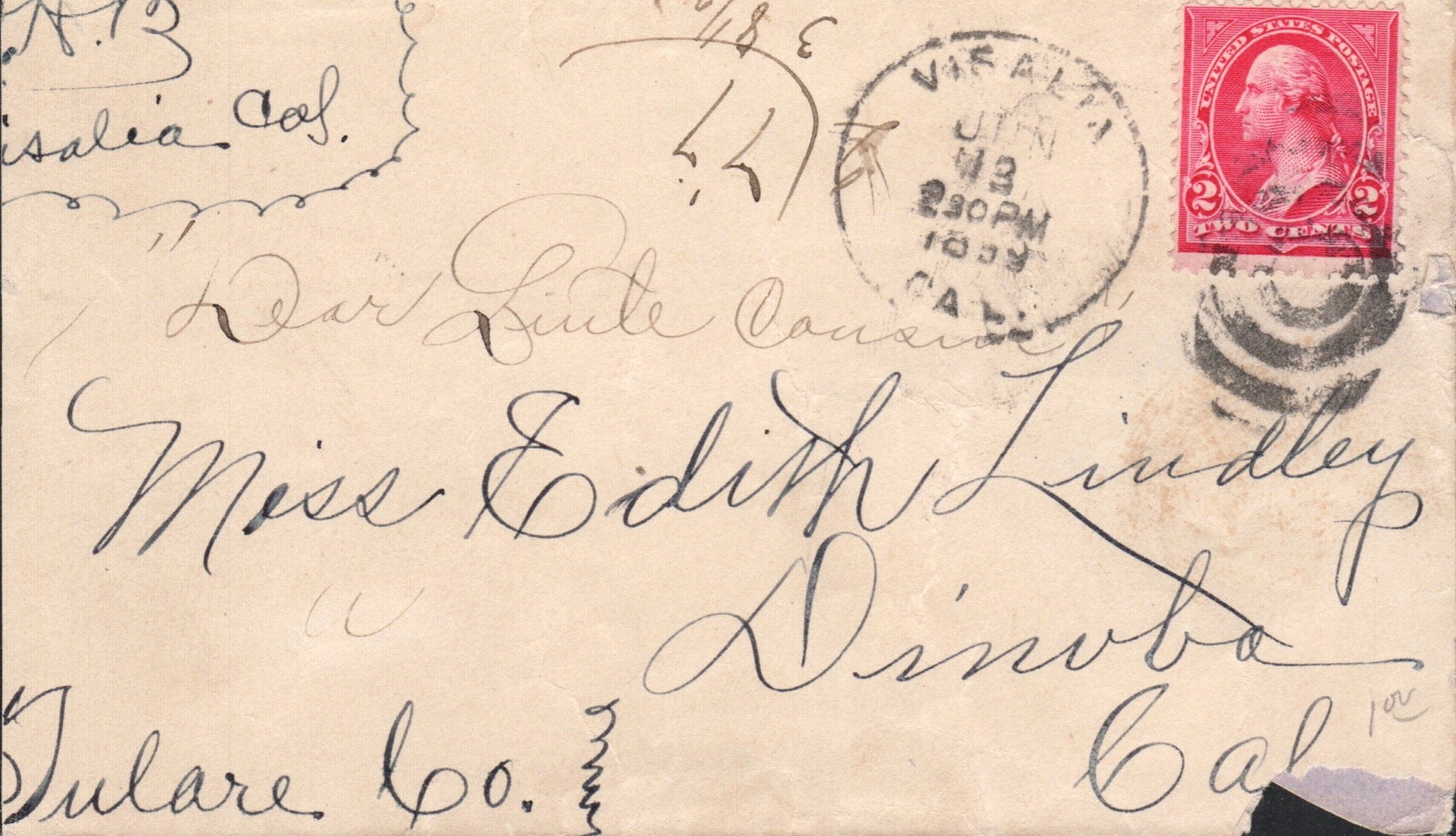 Visalia 1899 cds & target killer on flawed cover, Dinuba backstamp;1899 duplex on cover; 1946 machine cancel on First Flight cover; 1971 machine cancel on cover
