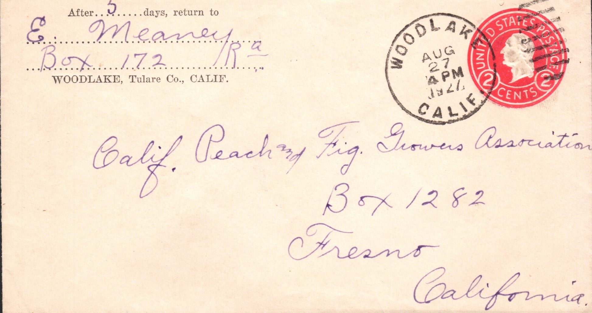 Woodlake 1913? 4-bar on post card; 1927 duplex on cover
