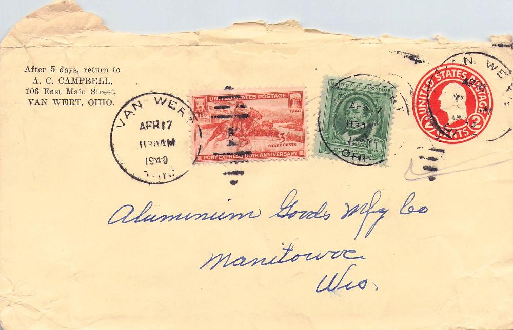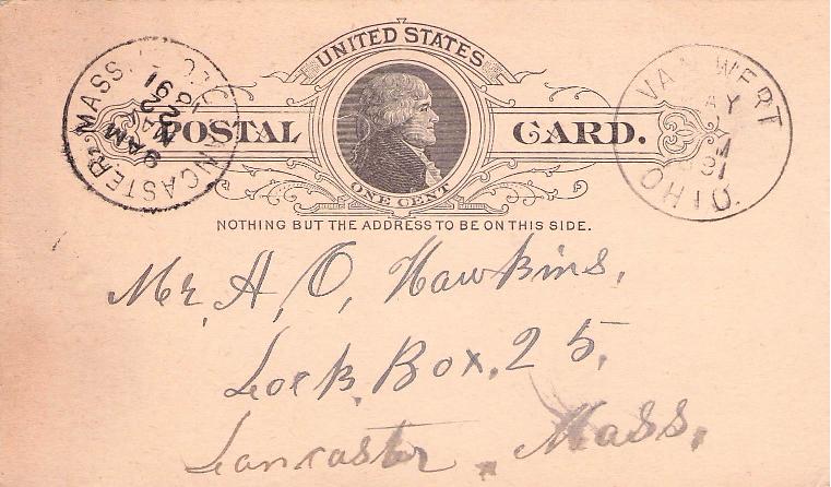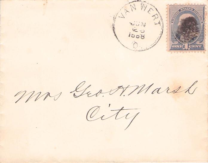 - Van Wert 1888 cds on cover; 1891 cds on Postal card; 1940 duplex on cover, Pony Express stamp.
