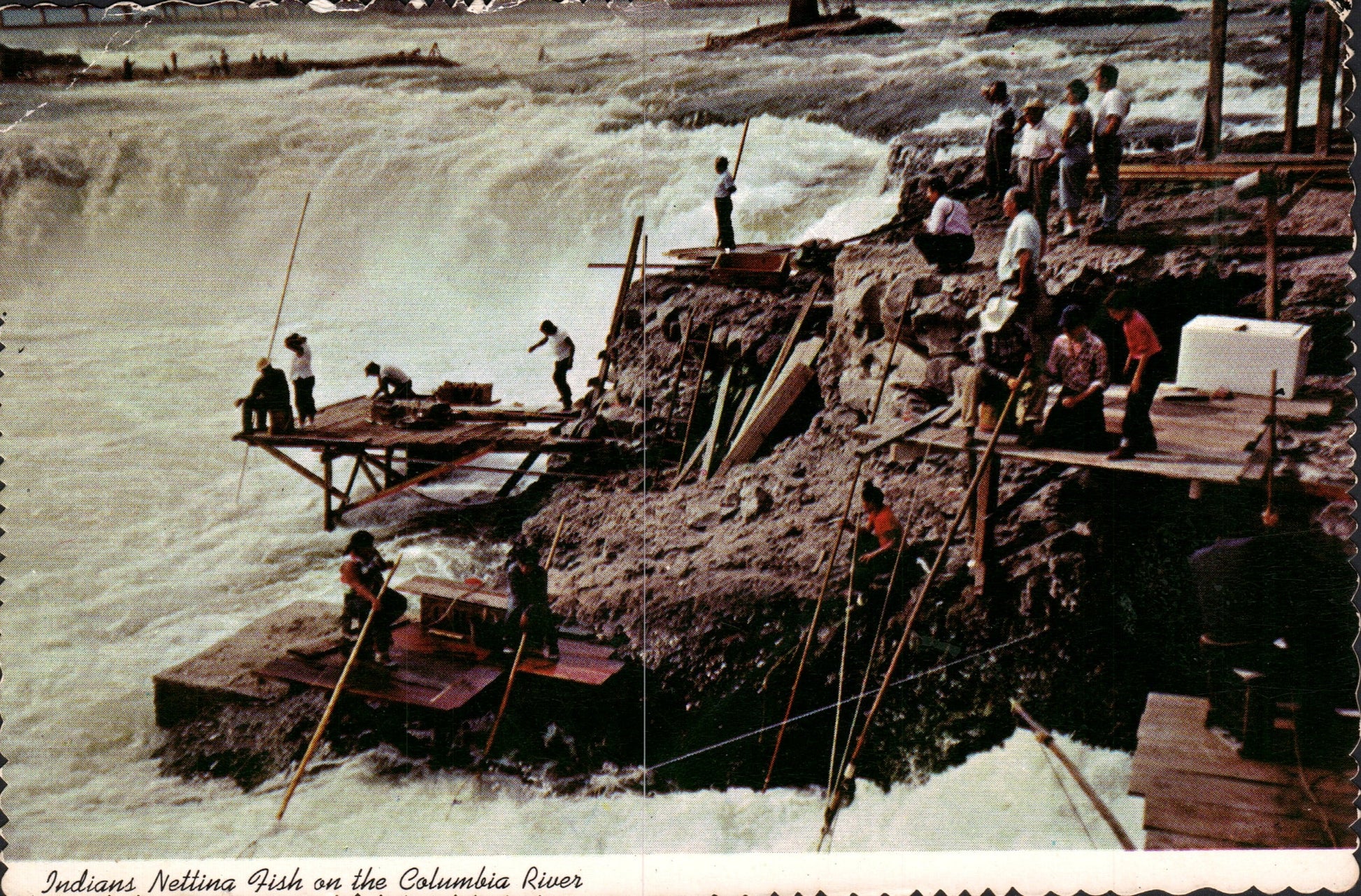 Celilo Falls Post cards: view of falls, Indian fishing, [chrome, stains on back]; Indians fishing [chrome, Continental size]