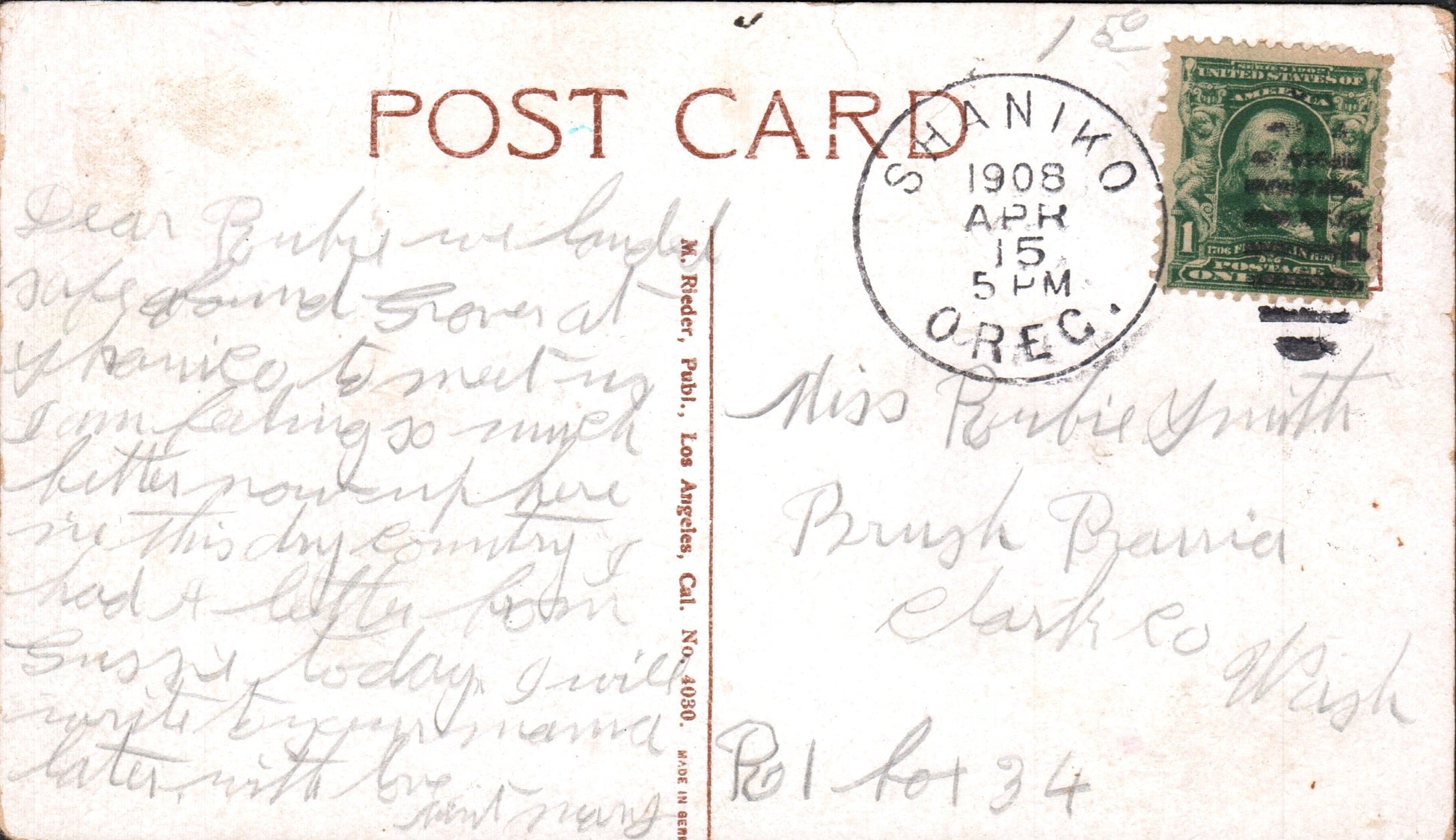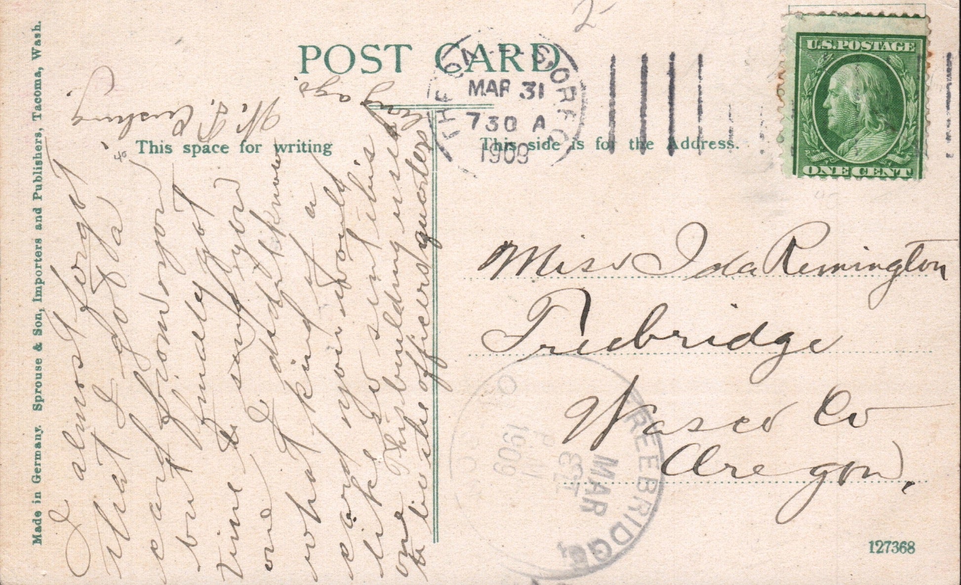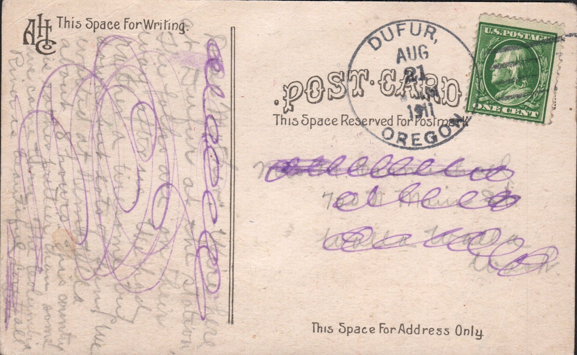 Freebridge (1908-1910) readable 4-bar as rec’d mark on top of The Dalles machine cancel on post card