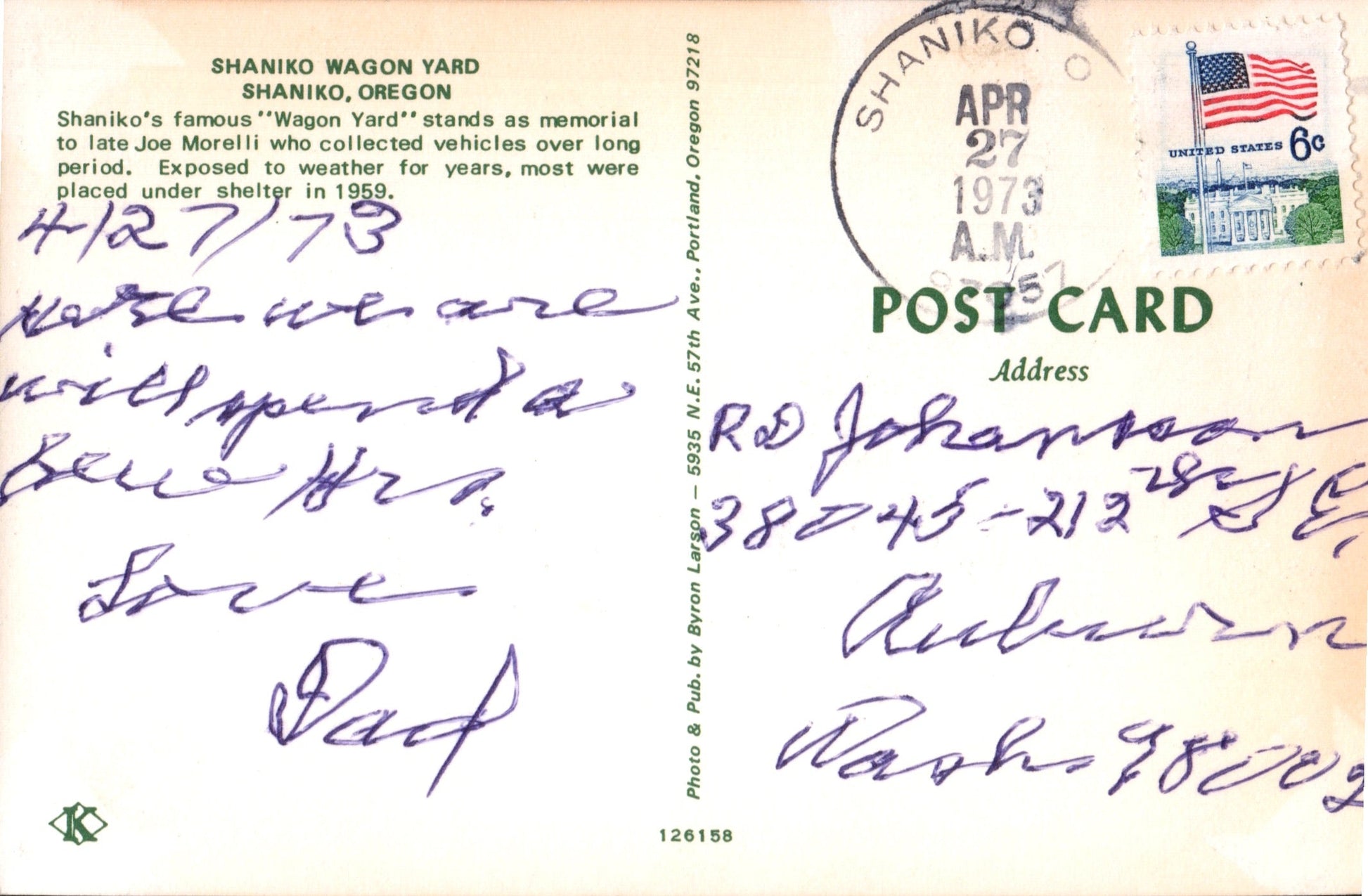 Shaniko 1908 duplex on post card; 1973 4-bar on post card