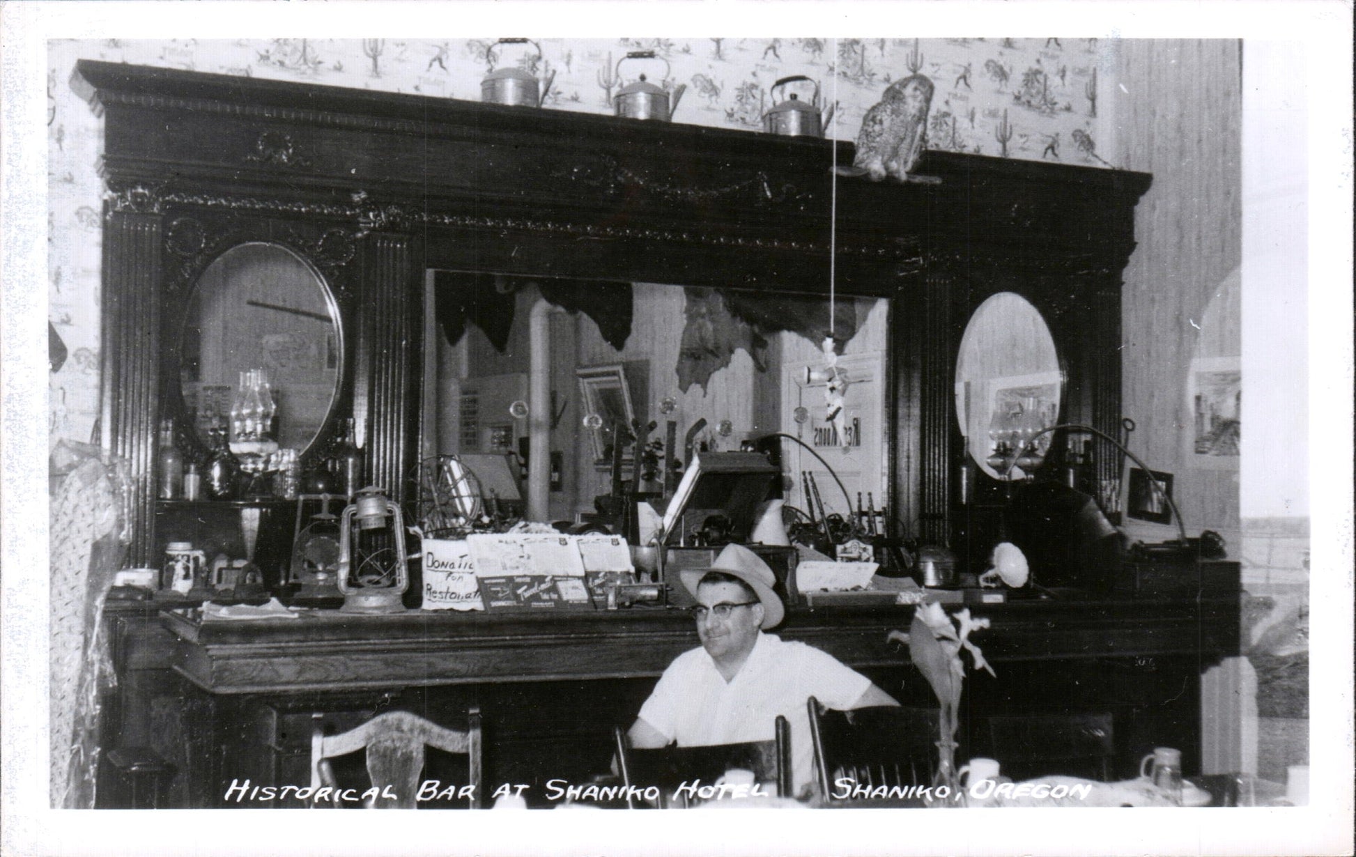 Post cards: Overview [2 chrome views]; Hotel [chrome]; Water Tower [chrome]; Old City Hall [chrome]; Old Schoolhouse [chrome]; “Historical Bar at Shaniko Hotel [real photo]