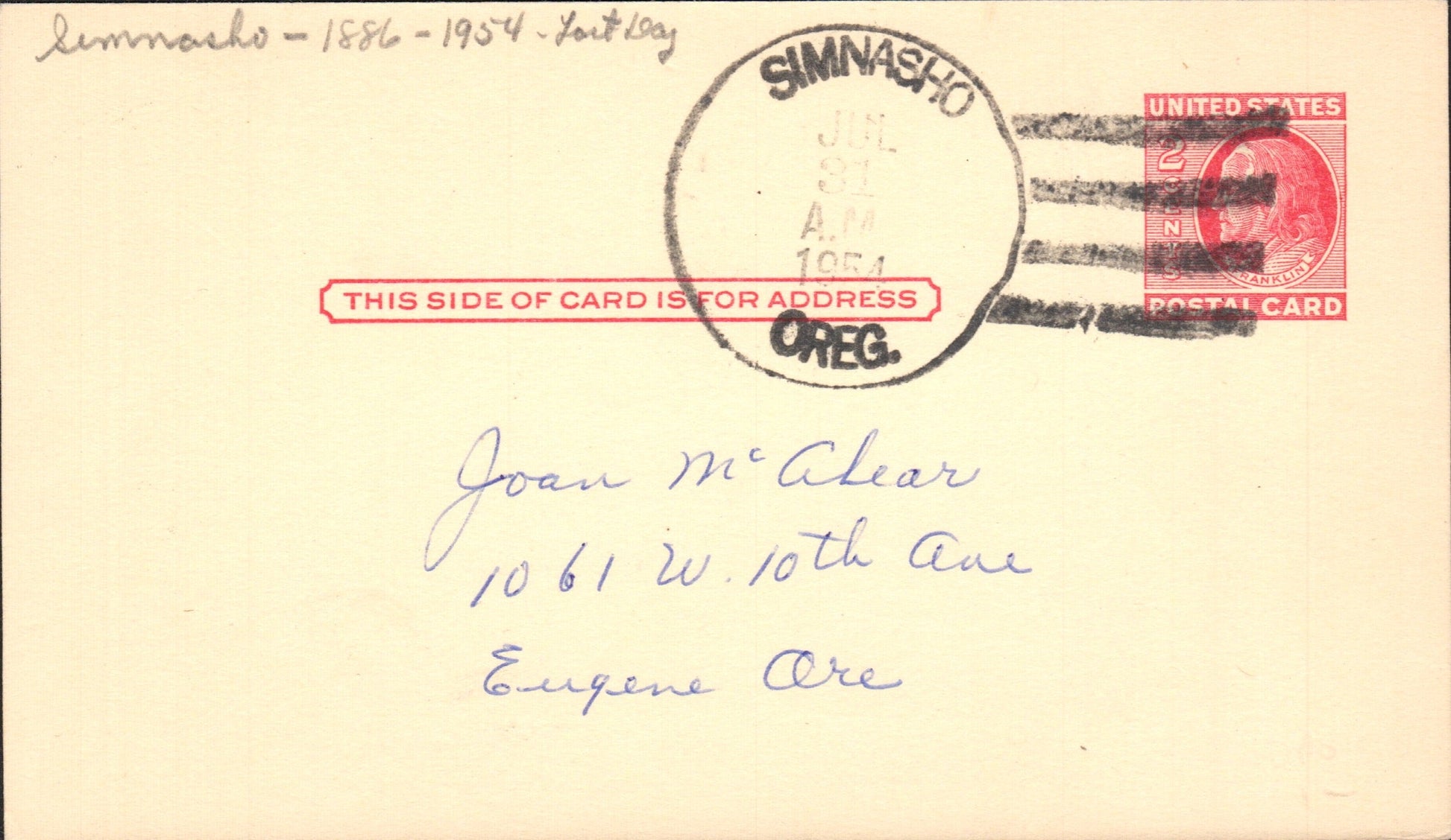 Simnasho (1886-1954) 1937 4-bar on cover, some stains, contains Christmas card; 1954 4-bar on LD Postal Card, round dater on back
