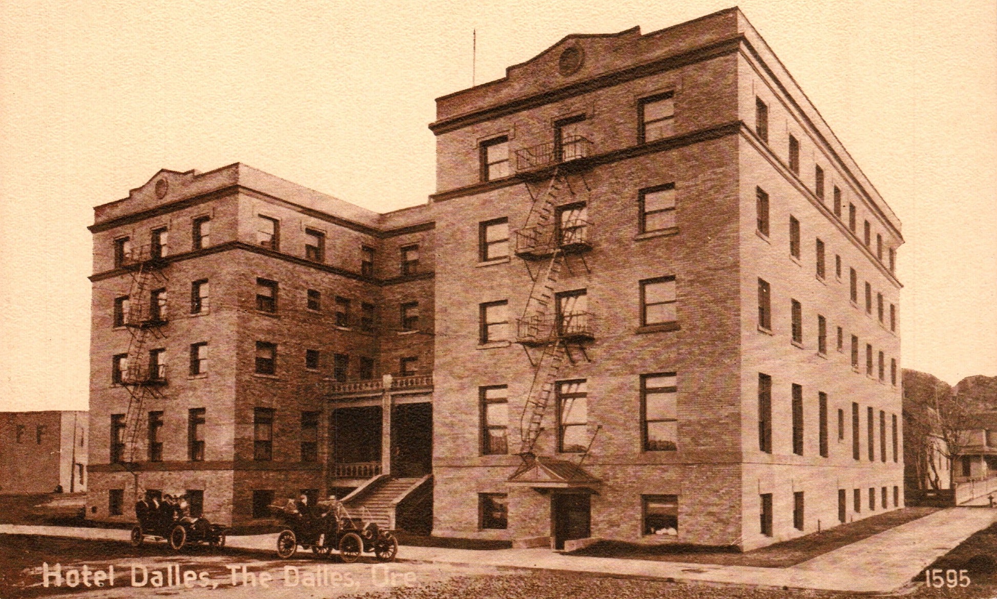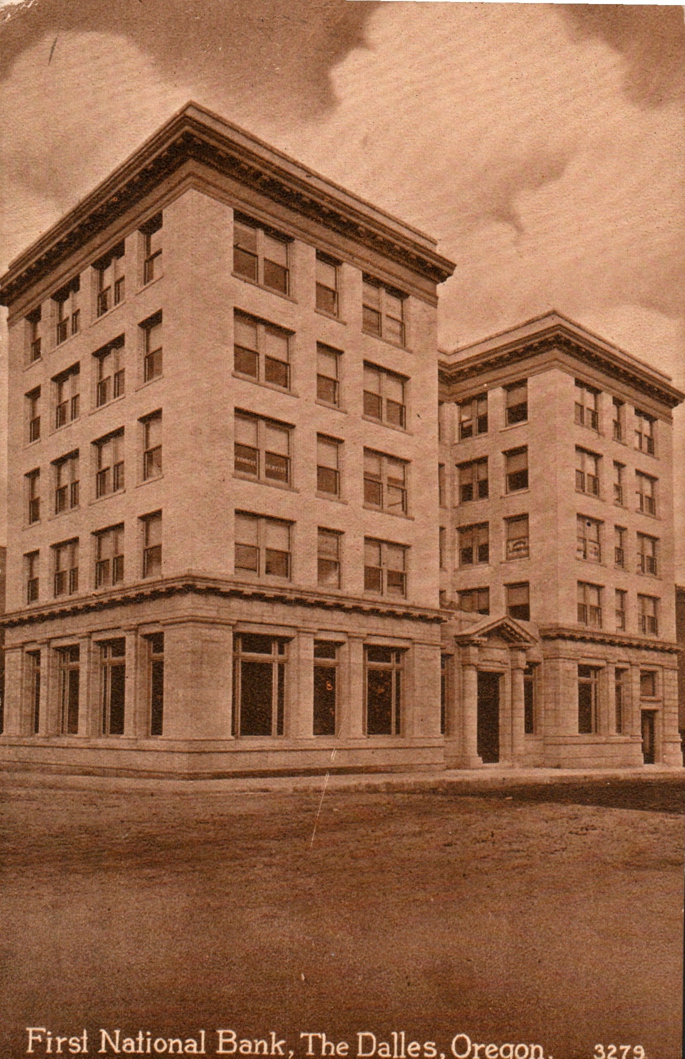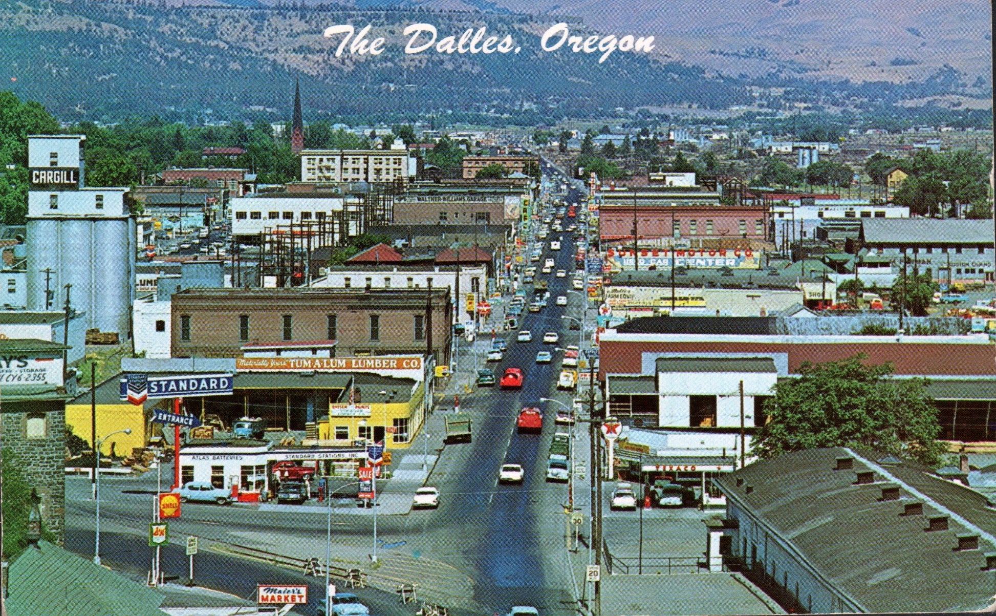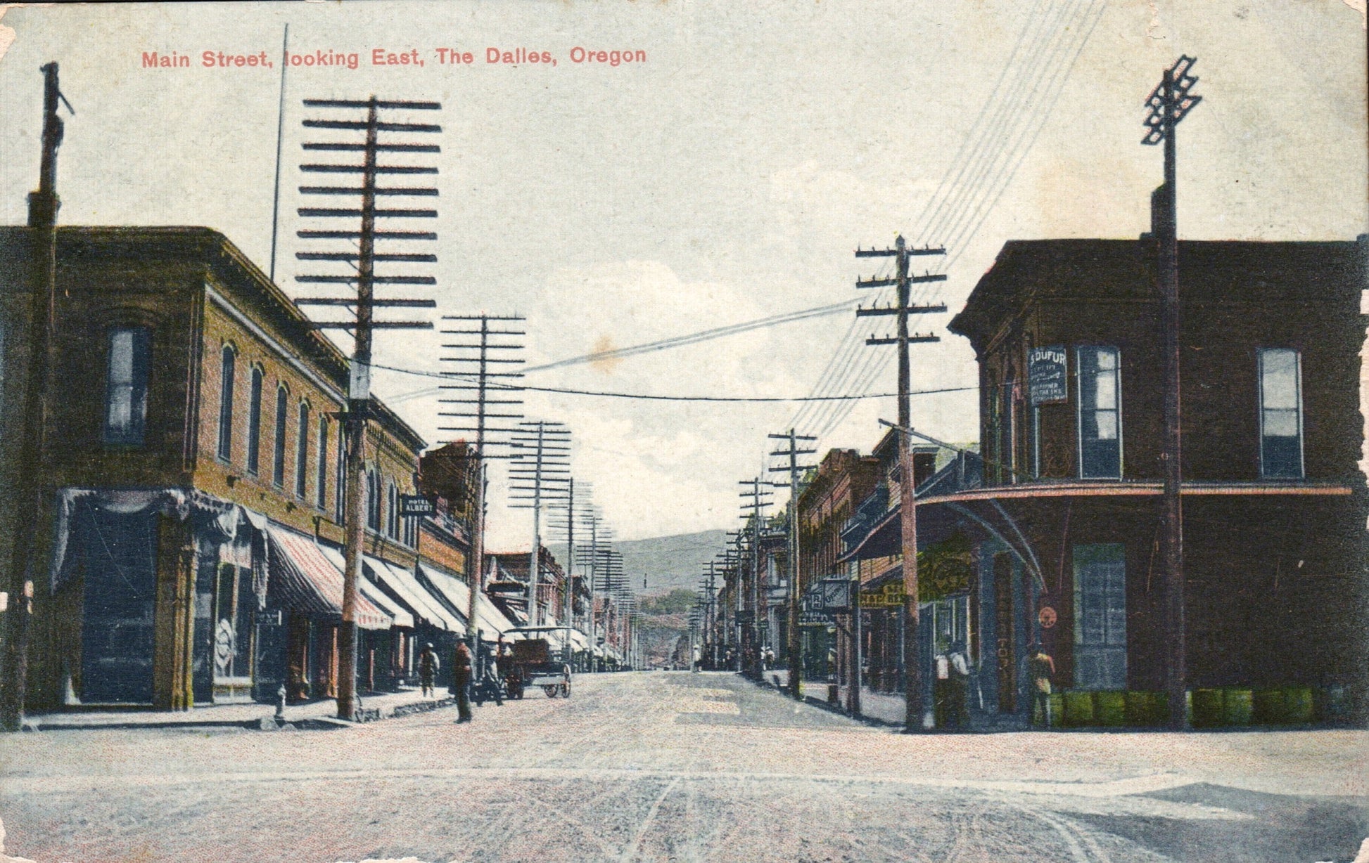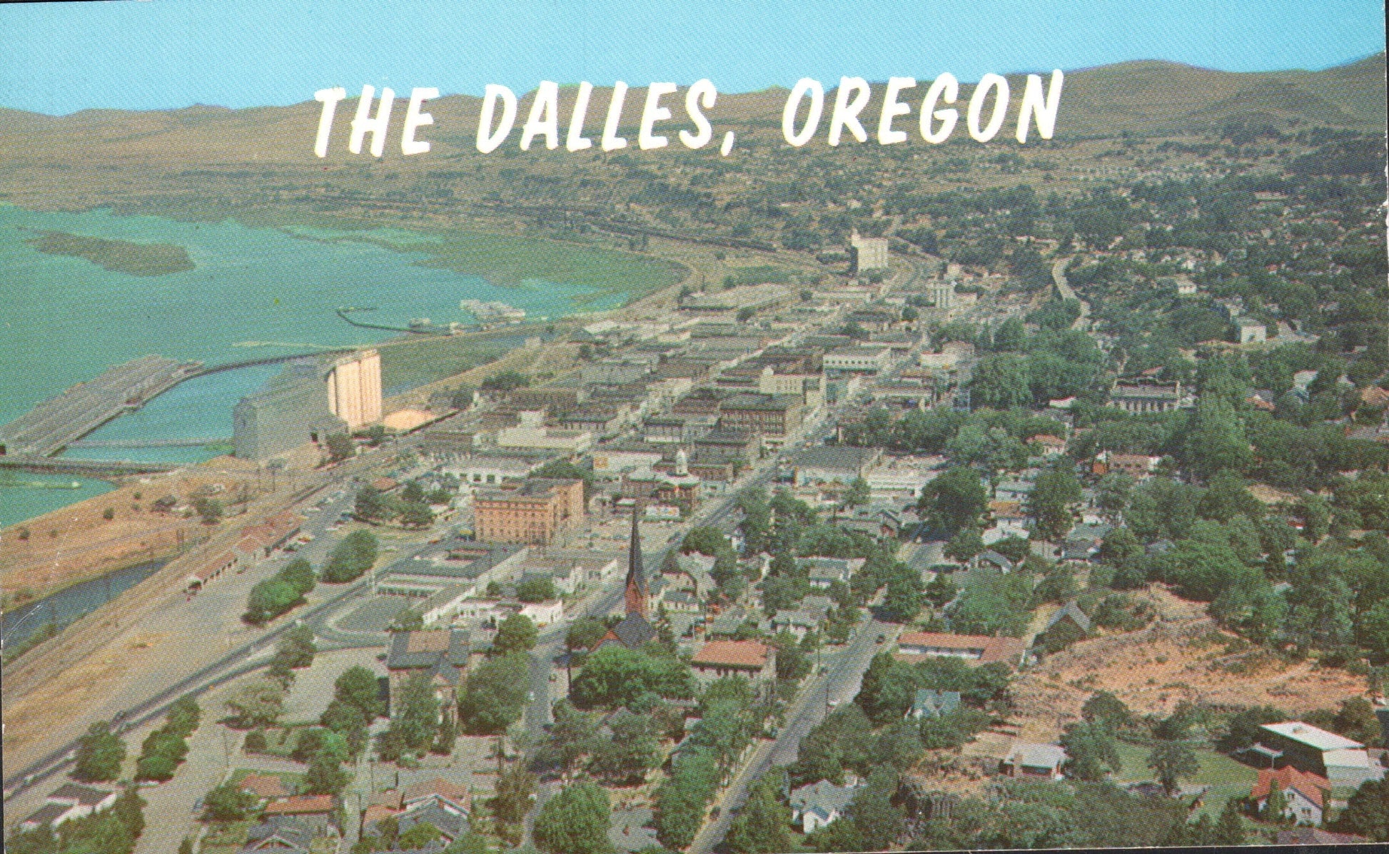 Post cards: Downtown aerial view [chrome]; overview of city and river [chrome]; Main street bird’s-eye view [chrome]; view of town from the river [chrome]; “Main Street Looking East” [c.1910]; Main Street with flags [c.1910]; First National Bank [sepia, c.1910]; Hotel Dalles [sepia, c.1915]; Tapadera Motel [chrome]; Court House [c.1910, minor scuffs]; City Hall [c.1910]; Carnegie Library [1911, edge wear]; High School [c.1910]; Vogt Fountain and Rose Gardens [chrome]