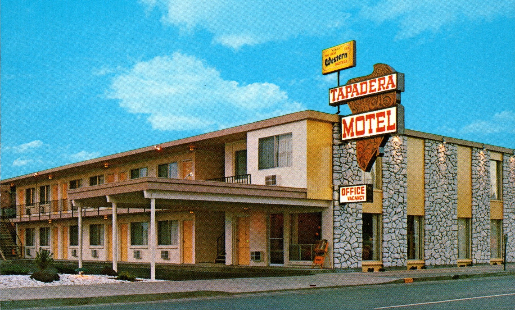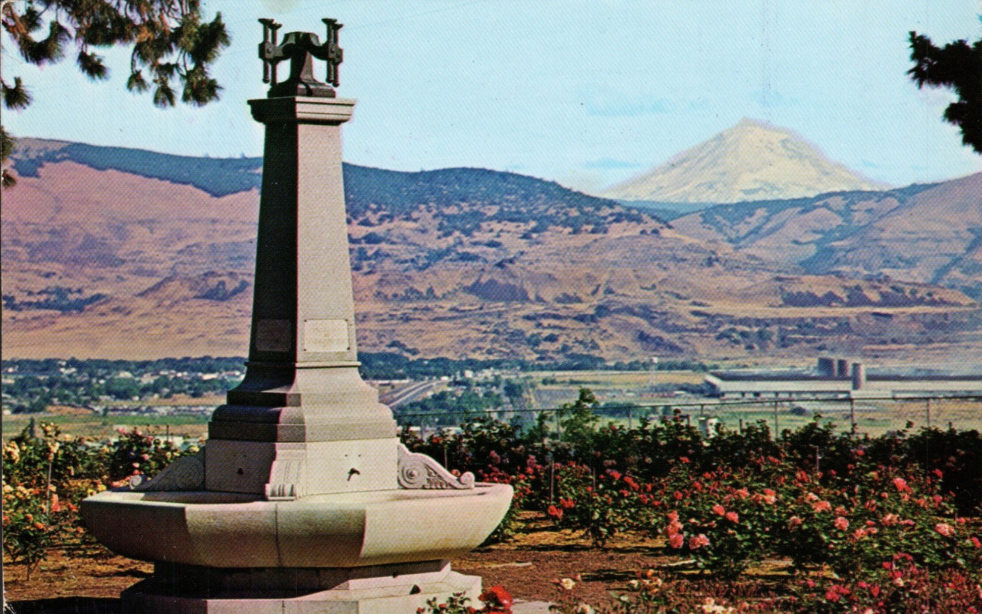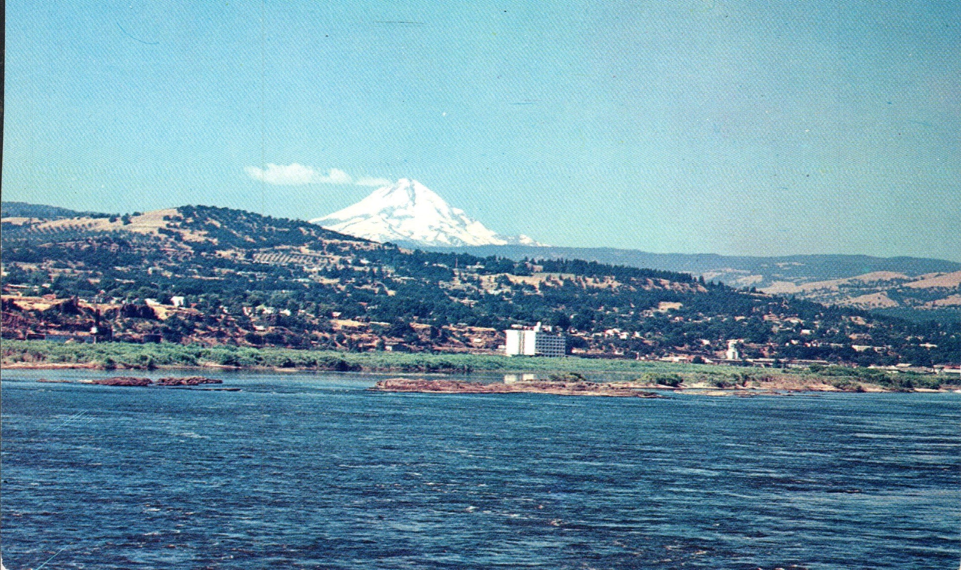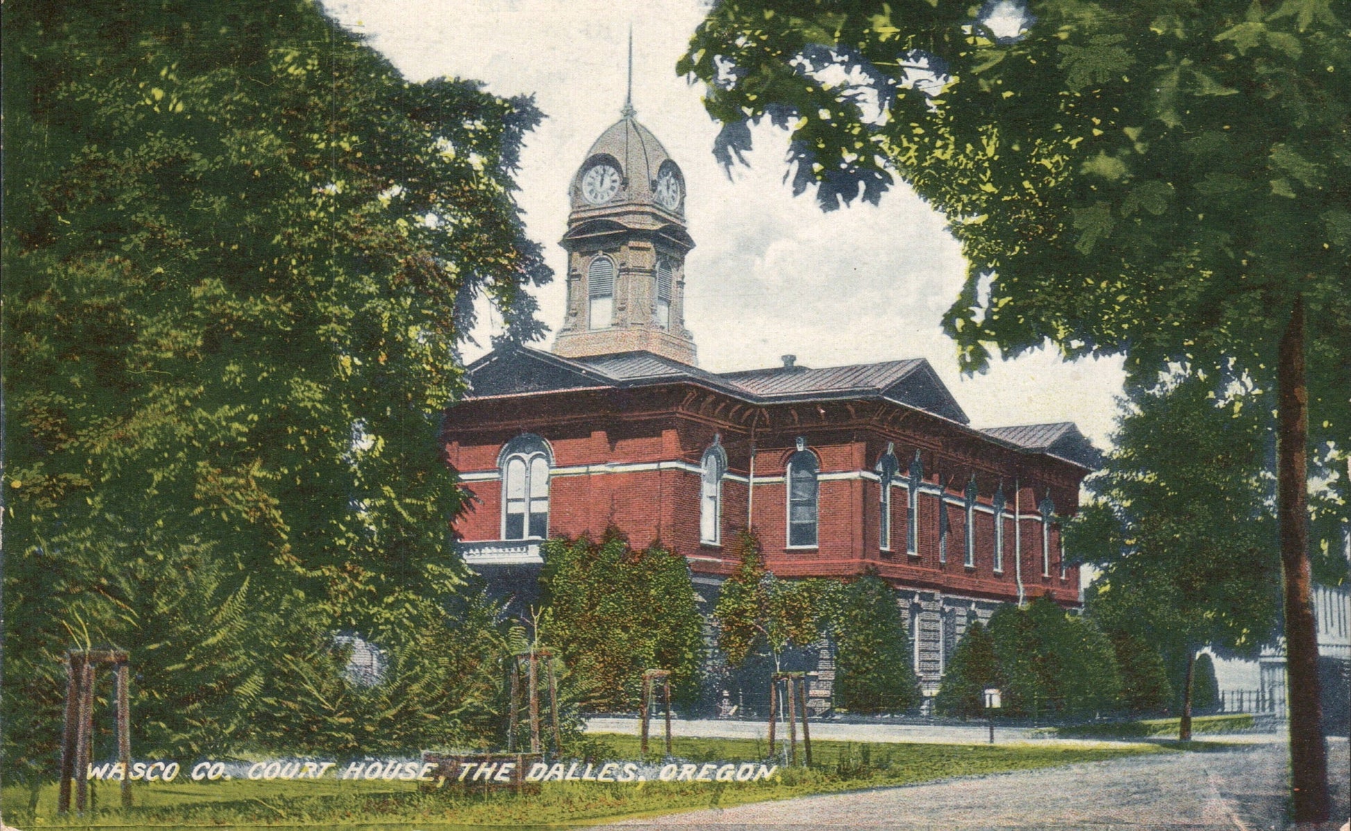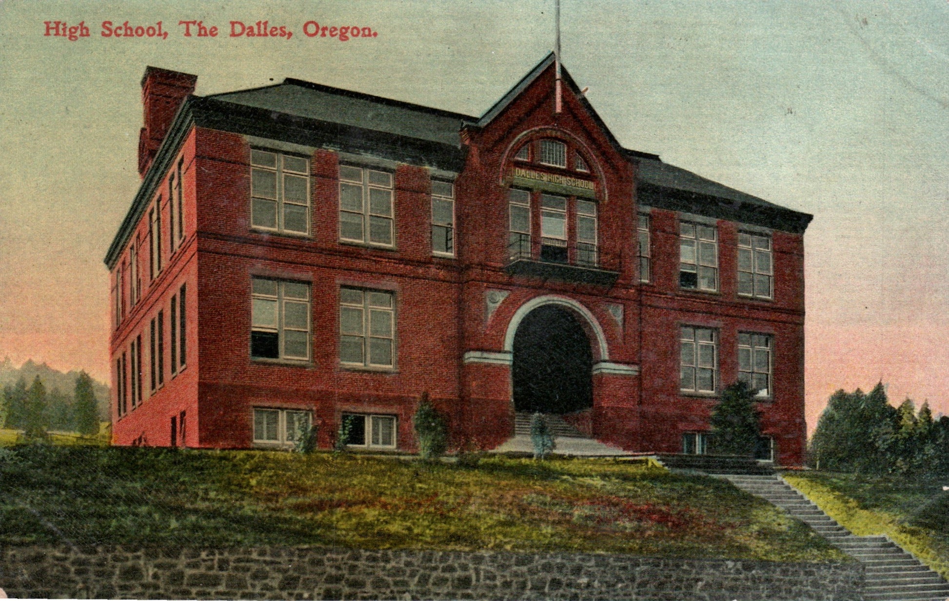 Post cards: Downtown aerial view [chrome]; overview of city and river [chrome]; Main street bird’s-eye view [chrome]; view of town from the river [chrome]; “Main Street Looking East” [c.1910]; Main Street with flags [c.1910]; First National Bank [sepia, c.1910]; Hotel Dalles [sepia, c.1915]; Tapadera Motel [chrome]; Court House [c.1910, minor scuffs]; City Hall [c.1910]; Carnegie Library [1911, edge wear]; High School [c.1910]; Vogt Fountain and Rose Gardens [chrome]
