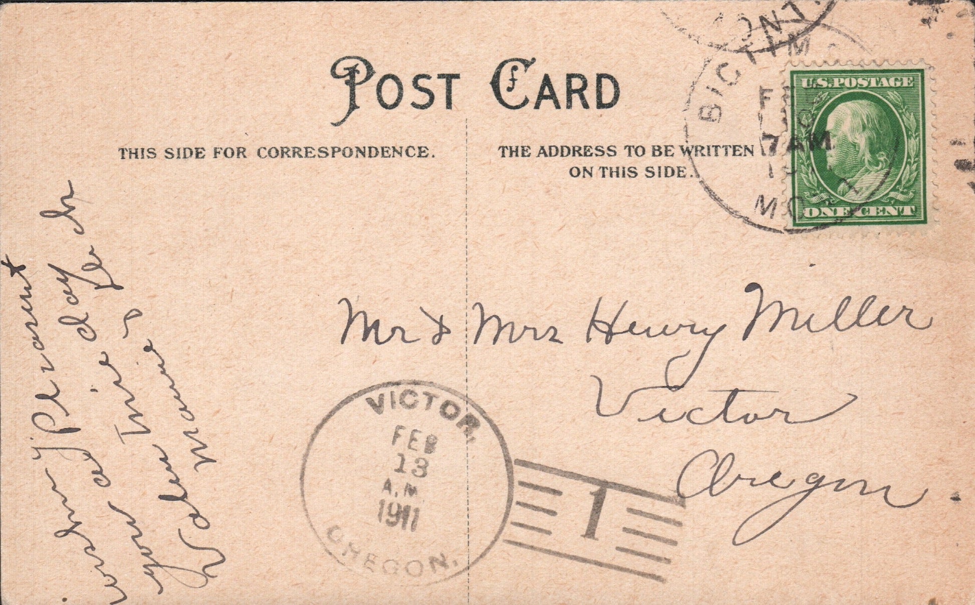 Victor (1893-1912) 1911 Doane 1 as rec’g mark on post card from Big Timber MT
