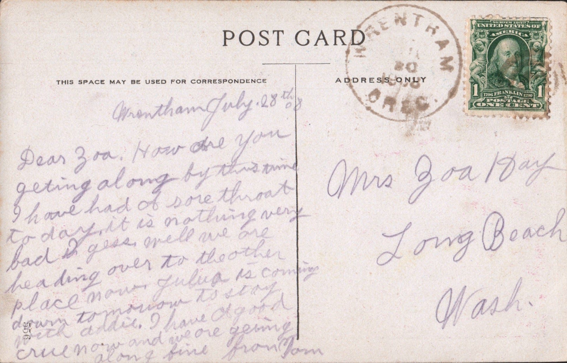 Wrentham (1900-1916) 1908 cds and target killer on post card
