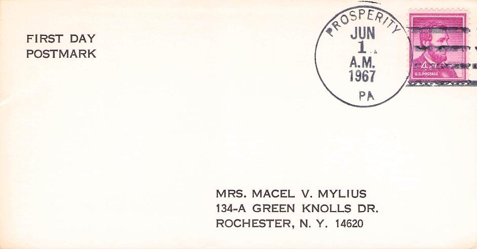 - Prosperity 1967 4-bar on cover-sized card, FD of postal status