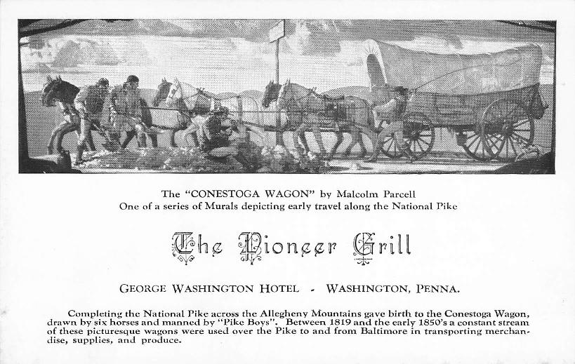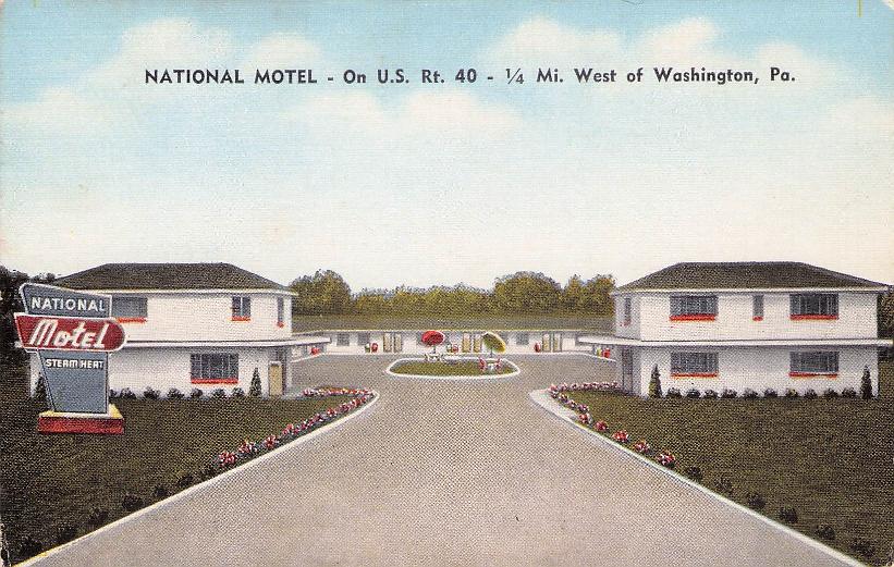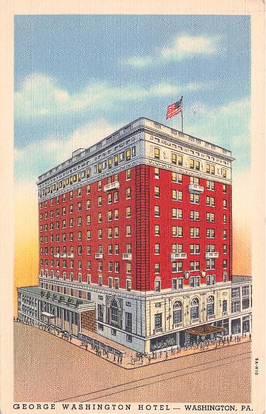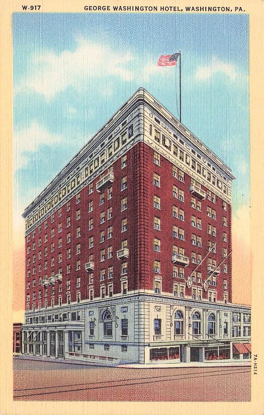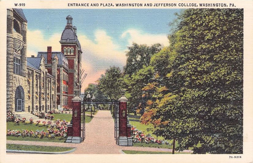 - Post cards: “George Washington Hotel” [2 linen]; George Washington Pioneer Grill” [B&W]; National Motel [linen]; Washington Hospital [linen]; “Washington High School” [chrome]; “Wade Street” [c.1910]; Washington and Jefferson Collage (2 chrome views); “Catholic Church of the Immaculate Conception” [chrome]; “Entrance and Plaza, Washington and Jefferson College [linen]; “First Crematory in the United States” [chrome]
