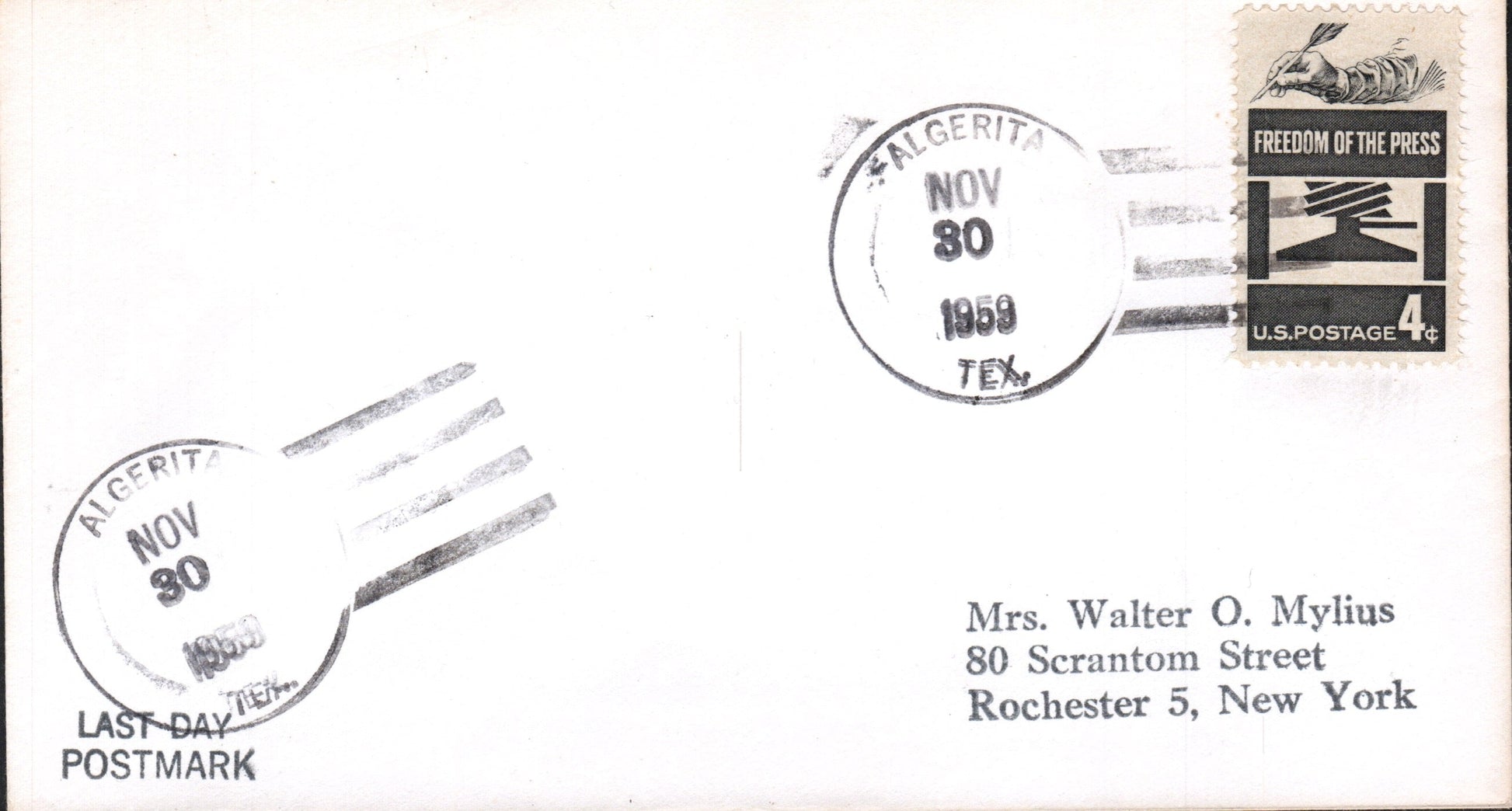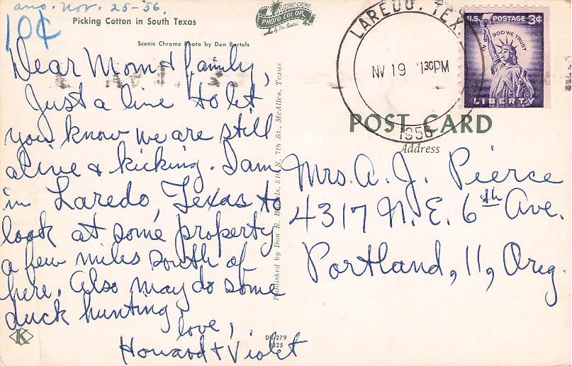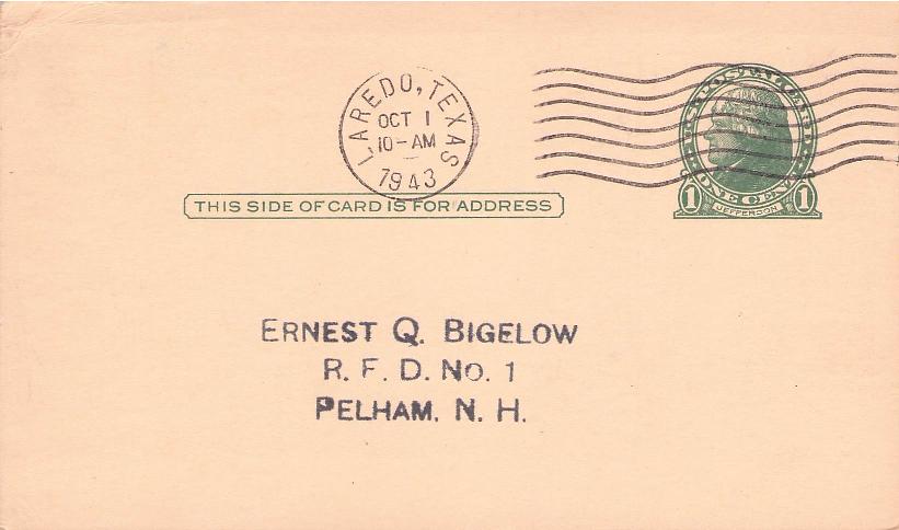 Laredo 1891 cds on cover, Milmo National Bank corner; 1943 machine cancel on Postal Card; 1956 double circle on post card; 1970 machine cancel on cover.