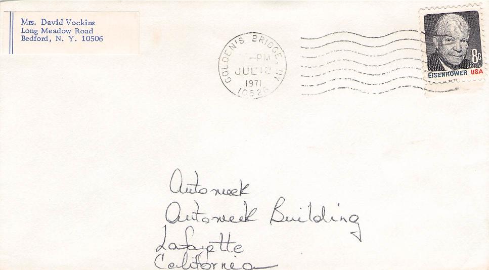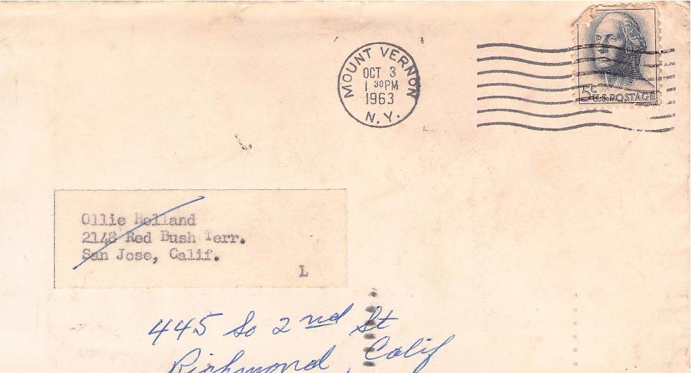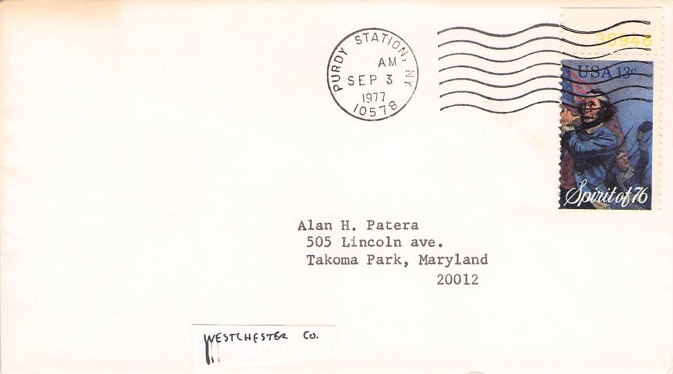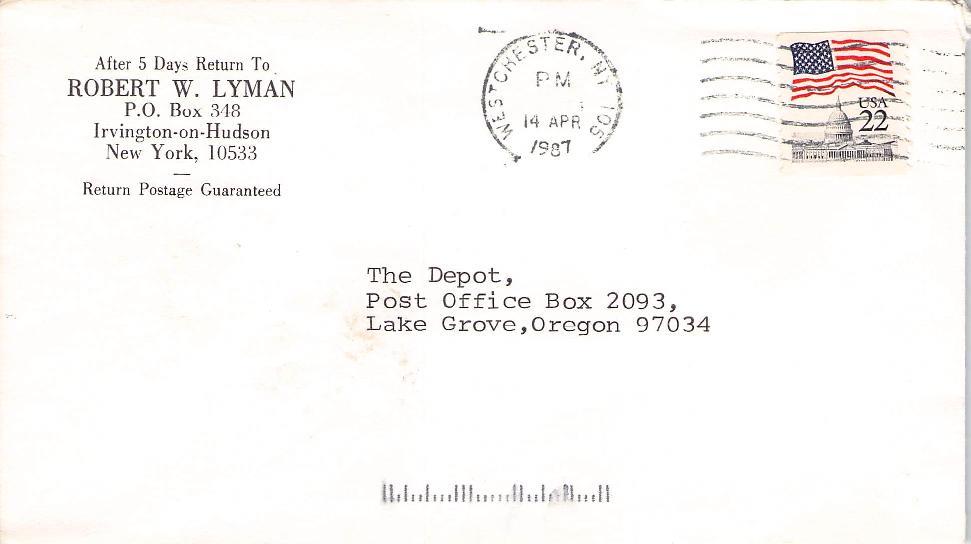 Thornwood 1988 no postmark but “Returned for Postage” and “Postage Paid Stamp Removed in Canceling Process” on cover with Thornwood return address