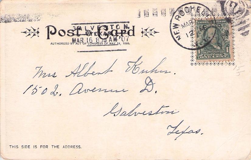 New Rochelle 1907 date-out duplex 2 on post card from Galveston, Texas.