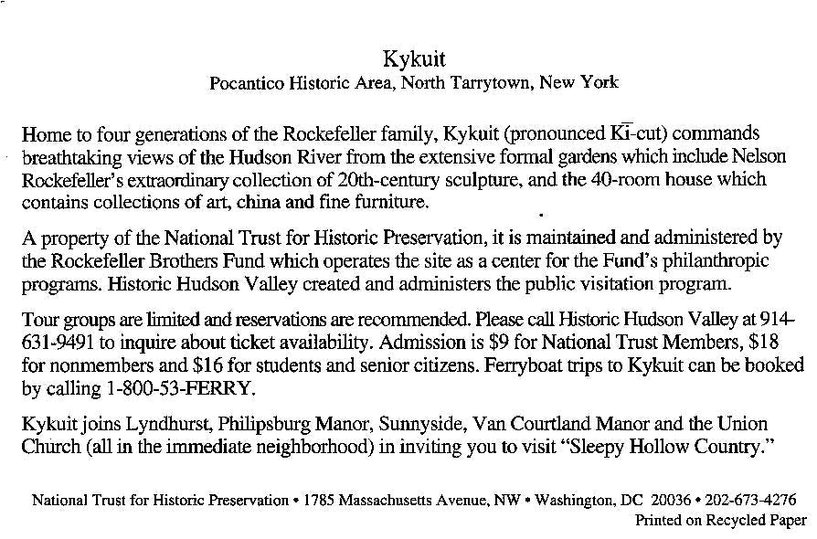 Post card: Old Dutch Church [chrome]; Kykuit [mansion, Continental info card]