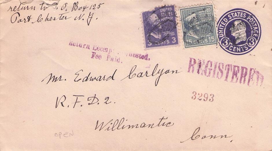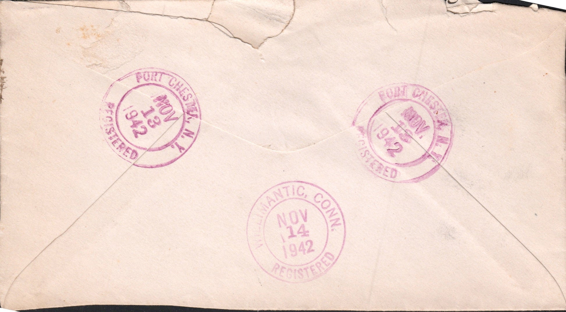 Port Chester 1942 Registered letter with 3¢ & 10¢ Prexy & auxiliary marking, 2 Port Chester & Willimantic Conn. Registered markings on back.