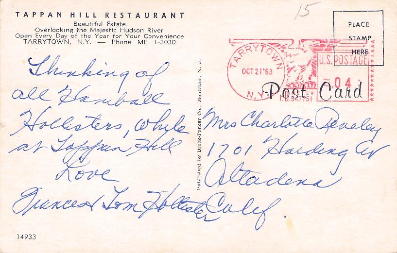 Tarrytown 1963 red meter on post card, “Tappan Hill Restaurant”