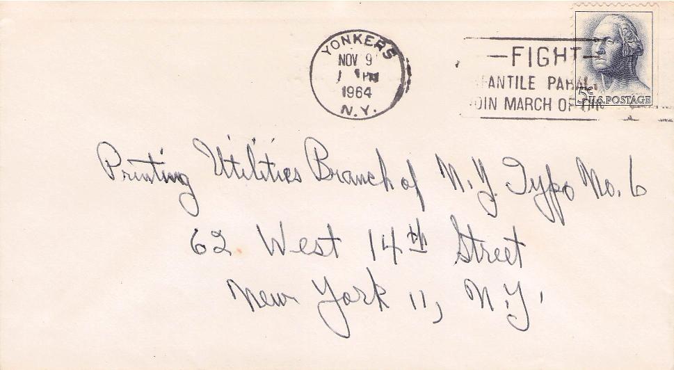 Yonkers 1964 machine slogan “March of Dimes” on cover.