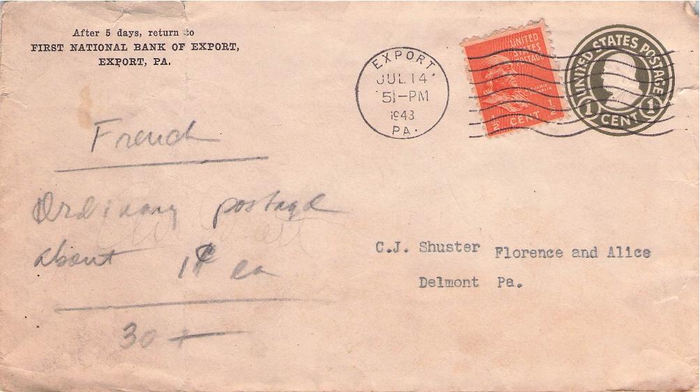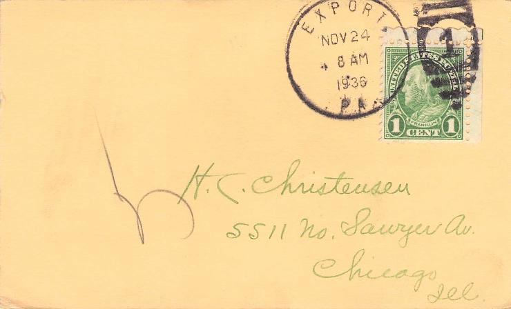 - Export 1912 duplex on post card; 1935 duplex on 3x5 card; 1948 machine cancel on cover [creased, w/ corner “First National Bank of Export”.