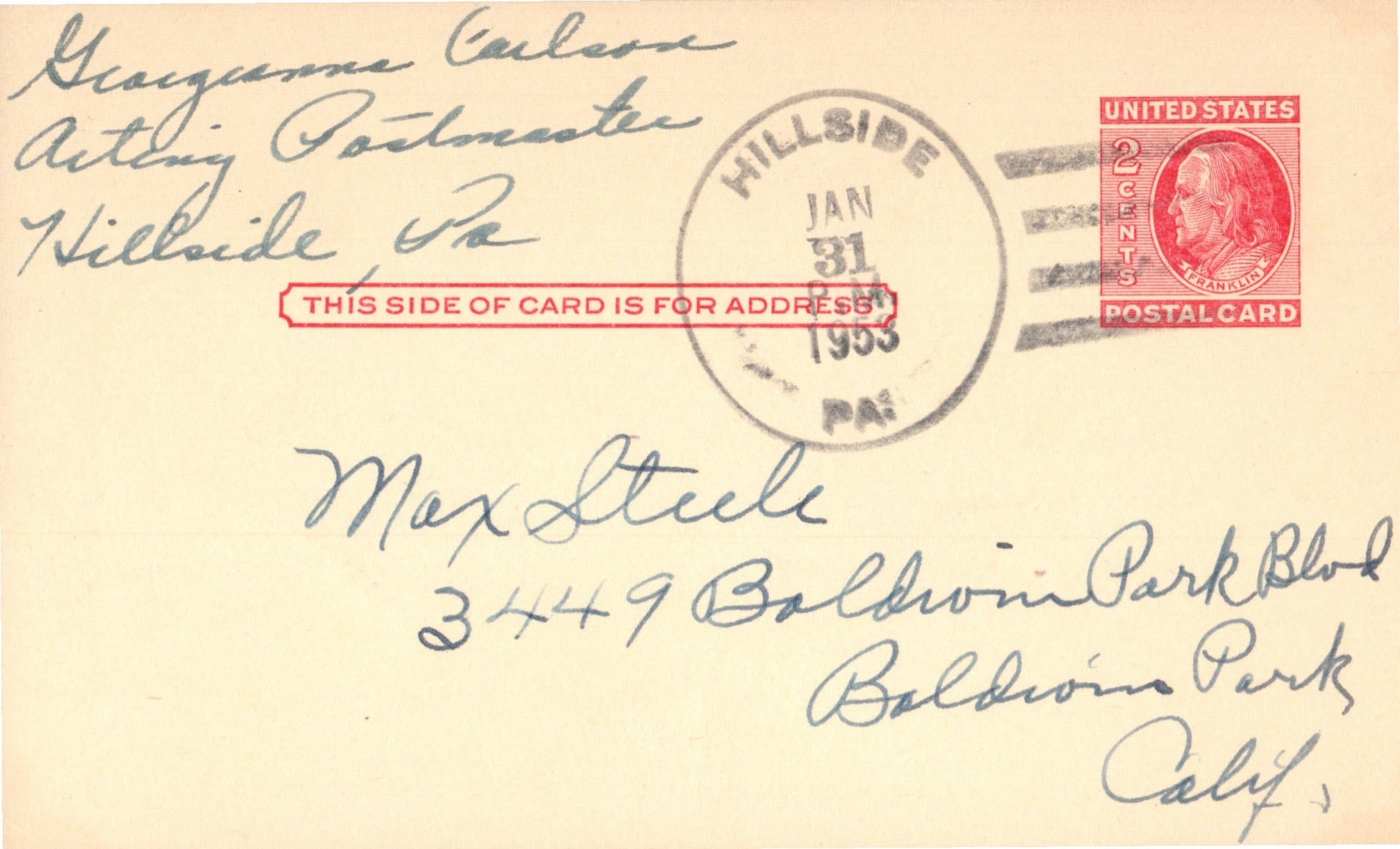- Hillside (1856-1953) 1953 4-bar on LD Postal Card, Act. PM autograph