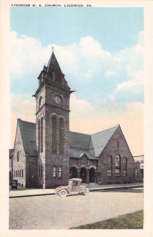 - Ligonier Post cards: M.E. Church [white border, c.1920]; Methodist church [chrome]; “Ligonier Diamond” [chrome]; Fort Ligonier [Continental-size chrome]