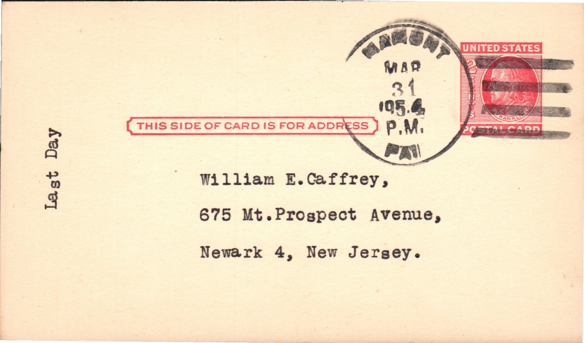 - Mamont (1898-1954) 1954 blurry 4-bar on LD Postal Card