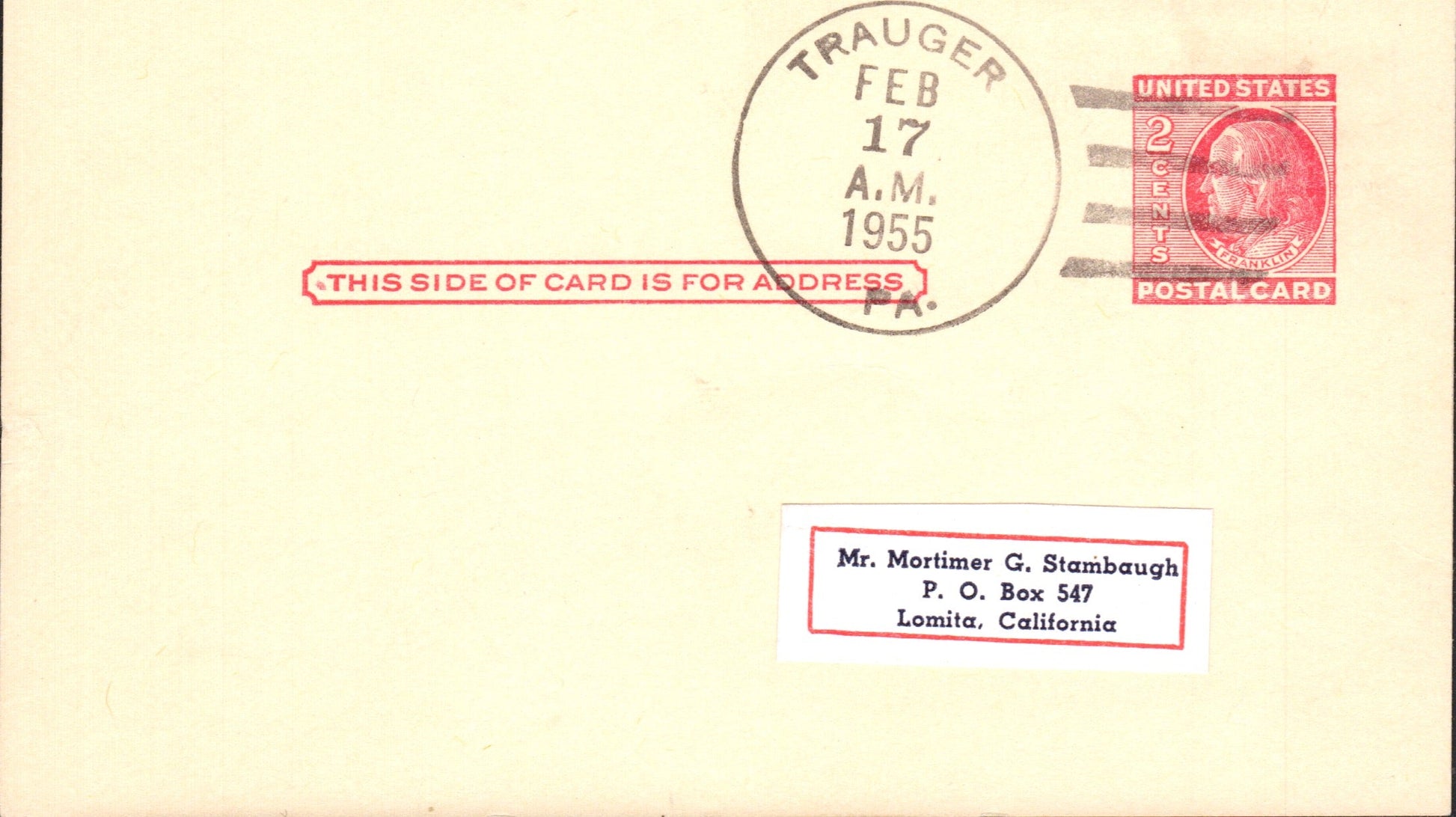 - Trauger (1890-1955) 1955 4-bar on Postal card; 1973 4-bar on cover